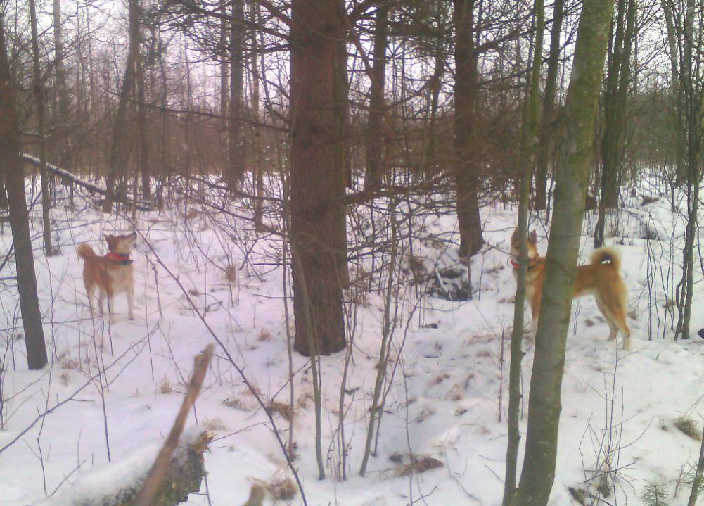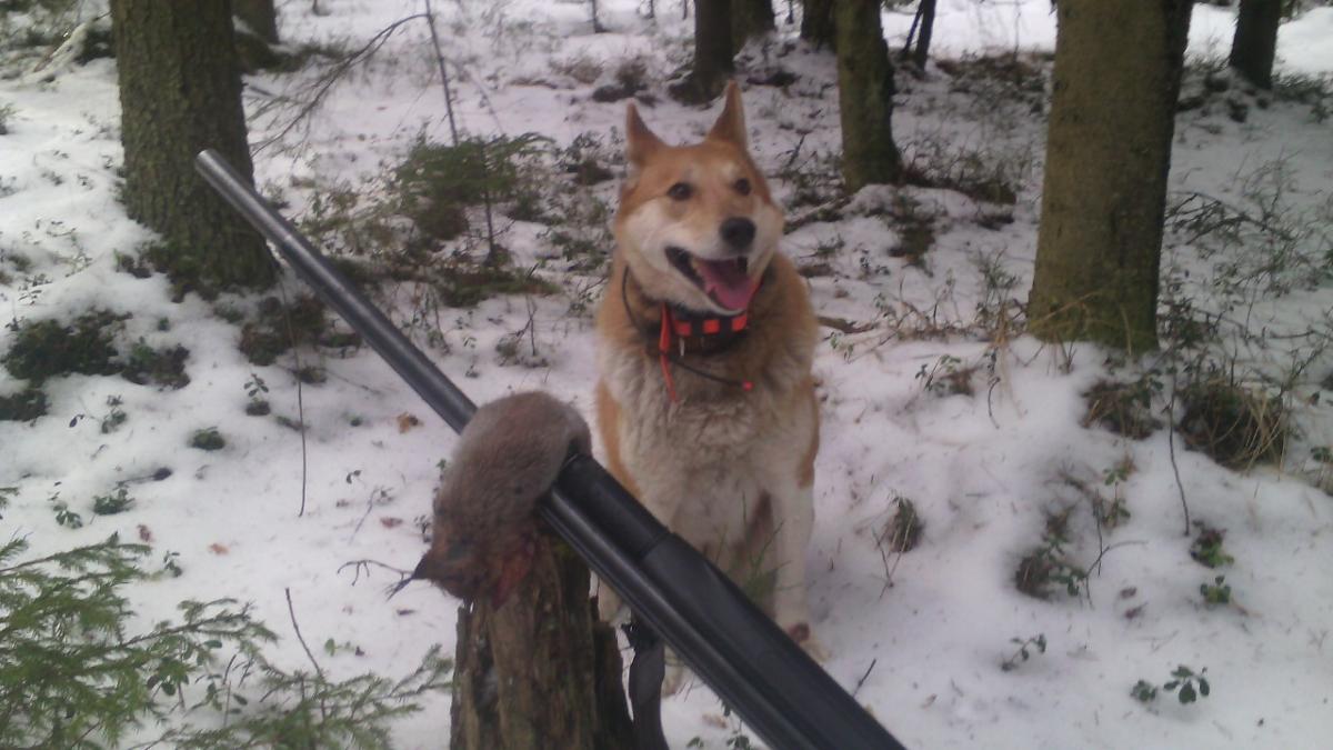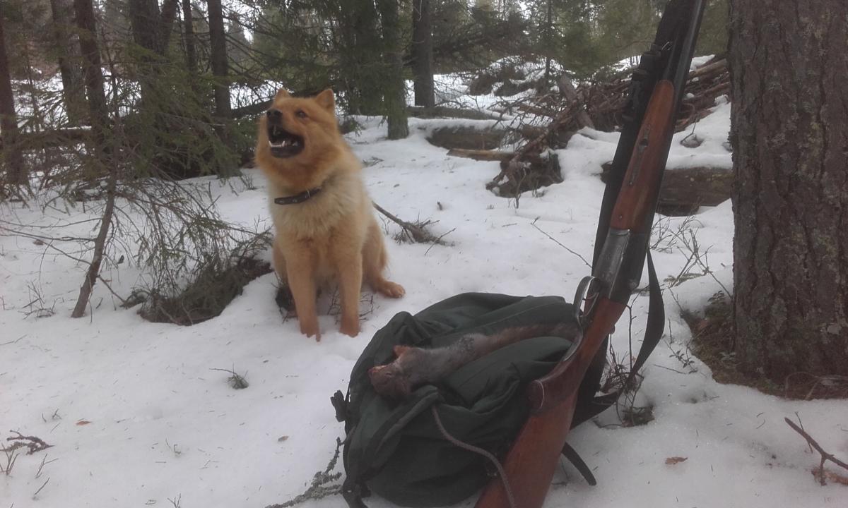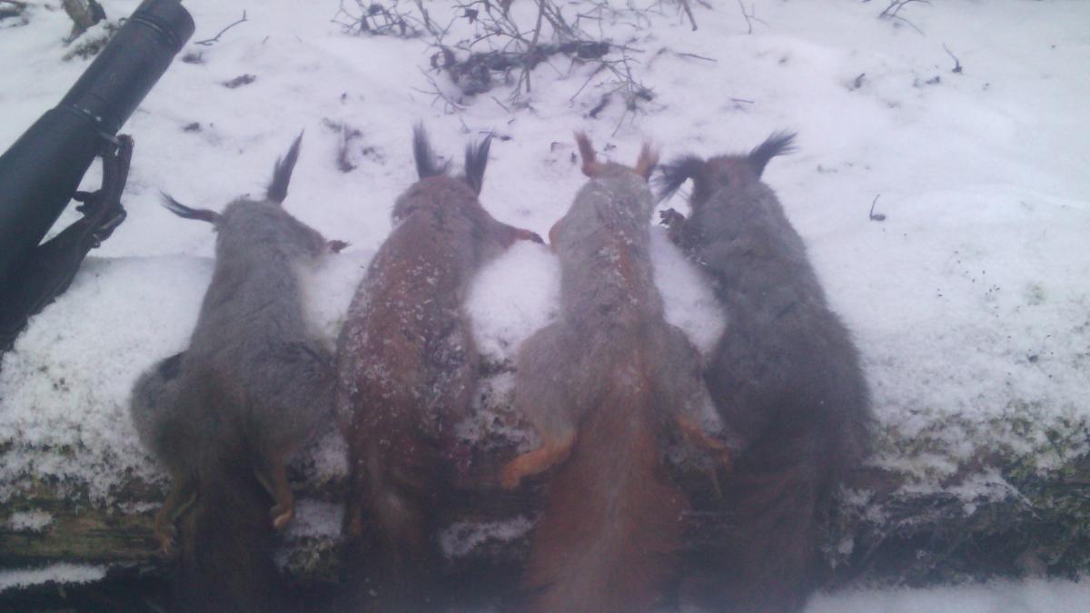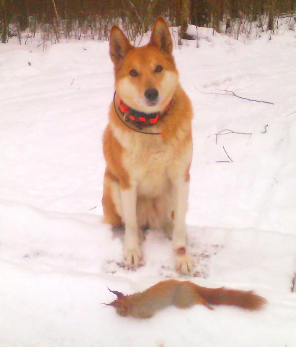 Вчера ходили со своим кобелём на охоту. Вообще, мы с ним каждое воскресенье в лесу (суббота отдана зимней рыбалке). В последнее время он перестал искать белок, я в принципе, особенно и не настаивал. У кобеля сейчас в приоритете глухарь. Но в лесу на снегу такая корка, что когда идешь, слышно на весь лес. Какой уж тут глухарь! Эта была вторая белка за последний час. Первую нашёл на высоченной ёлке, я так и не смог её разглядеть в ветках. Эта то же была на высокой елке, но ей не повезло, в бинокль разглядел.