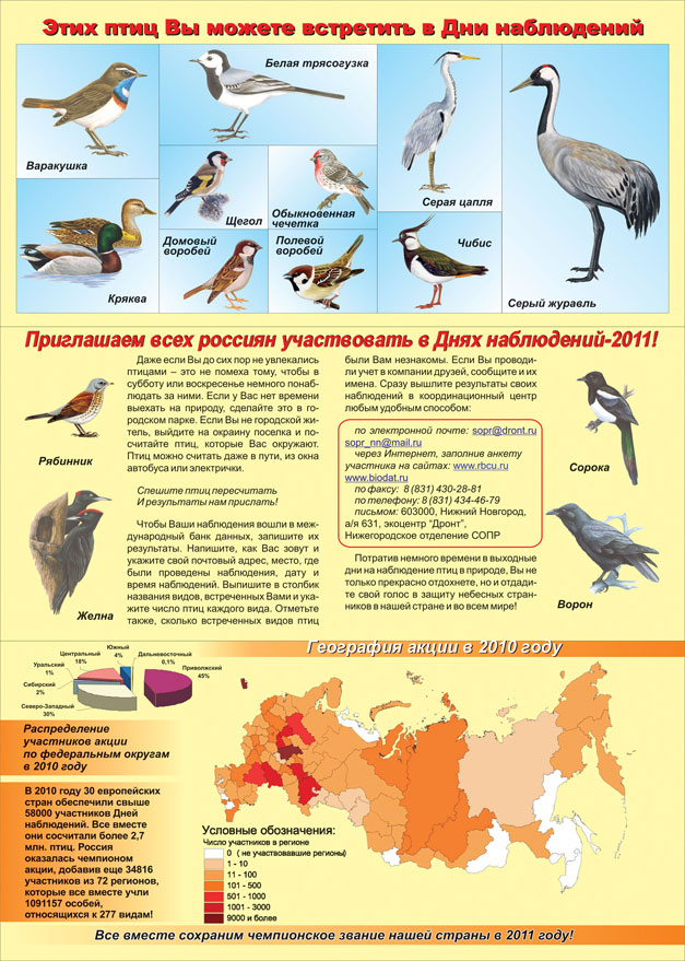 Даже если Вы до сих пор не увлекались птицами – это не помеха тому, чтобы в субботу или воскресенье немного понаблюдать за ними. Если у Вас нет времени выехать на природу, сделайте это в городском парке. Если Вы не городской житель, выйдите на окраину поселка и посчитайте птиц, которые Вас окружают. Птиц можно считать даже в пути, из окна автобуса или электрички.
