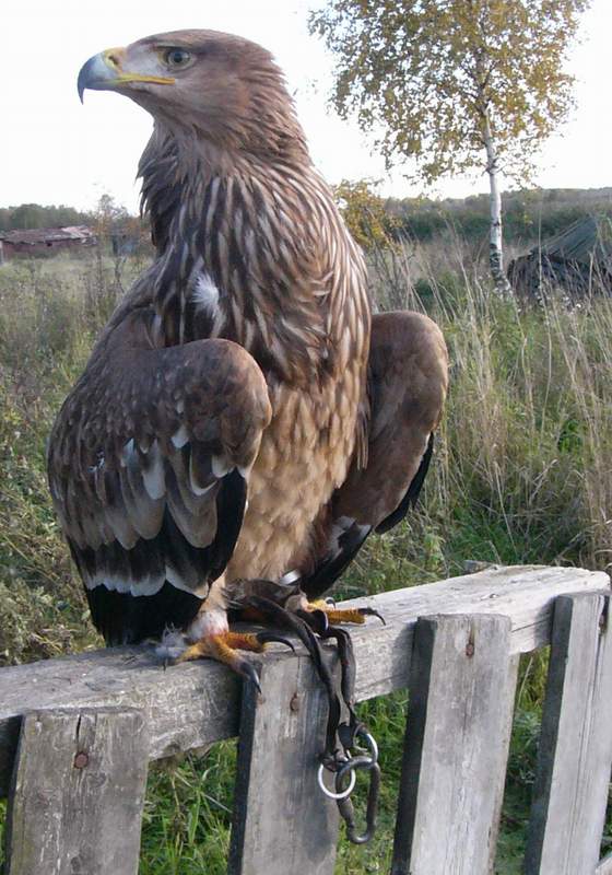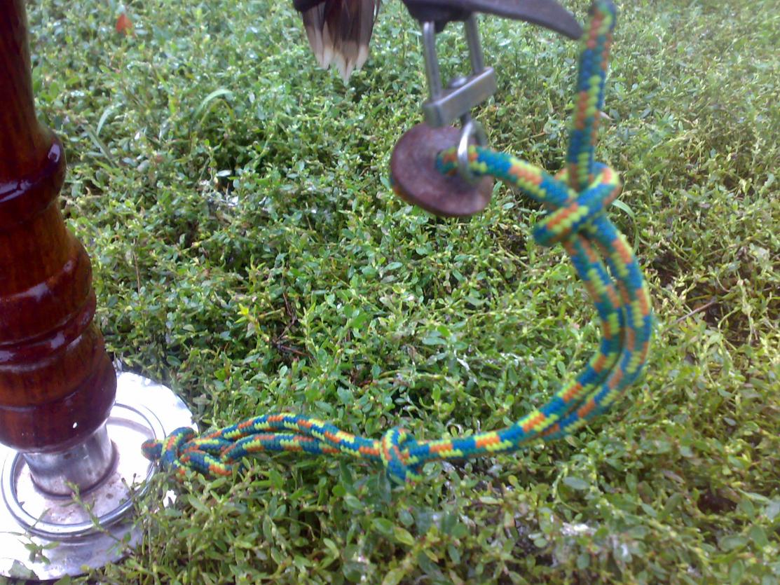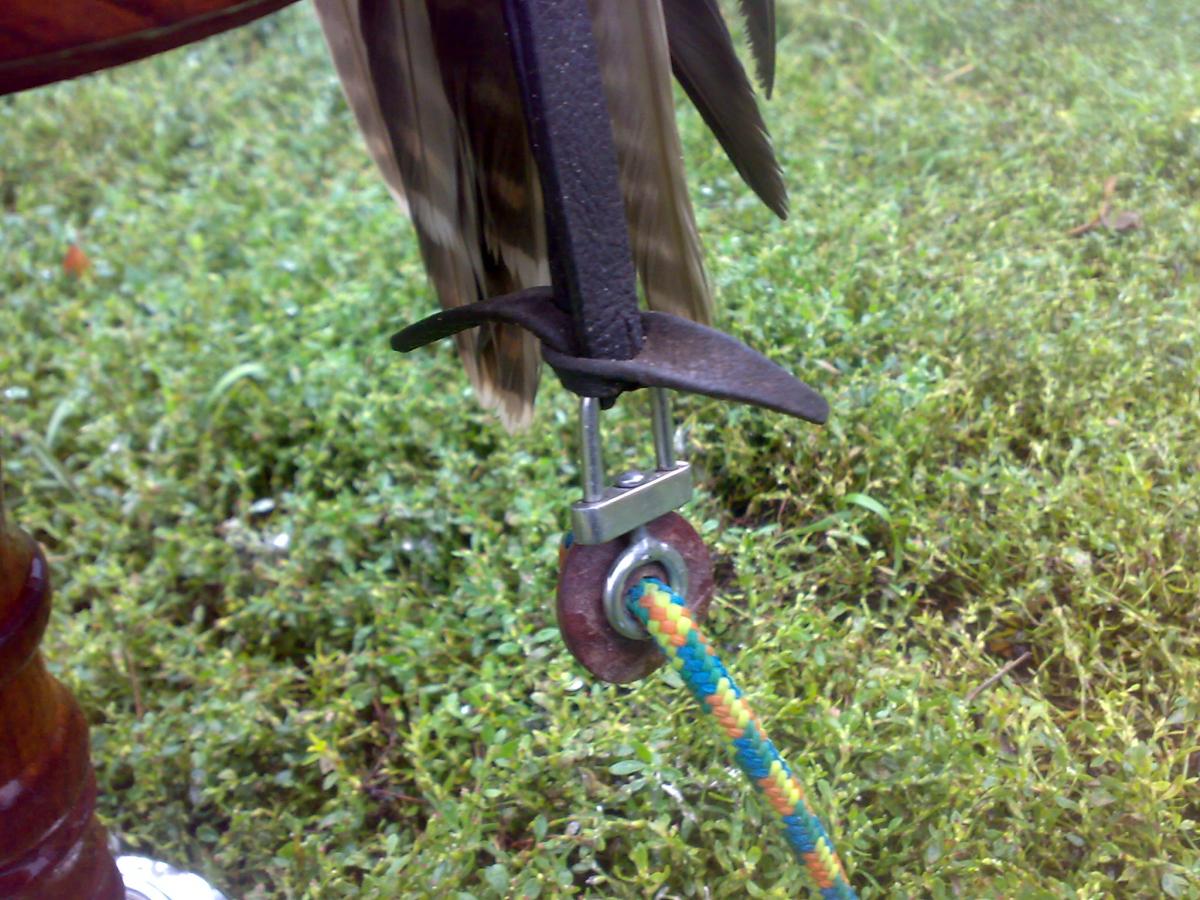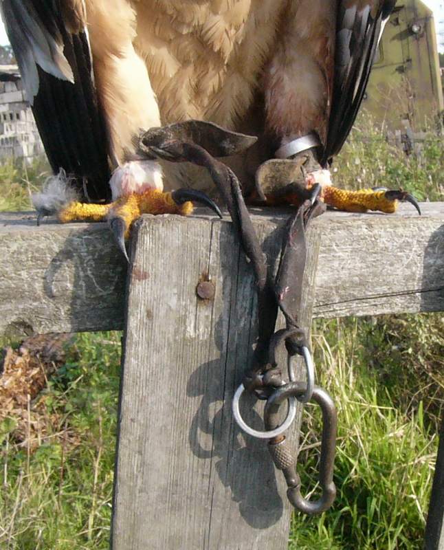 На мой взгляд не имеет смысла держать орлов привязывая их узлом (любым) к кольцу присады. У орлов какое то особенное умение распускать узлы, в этом я уже убеждался.
