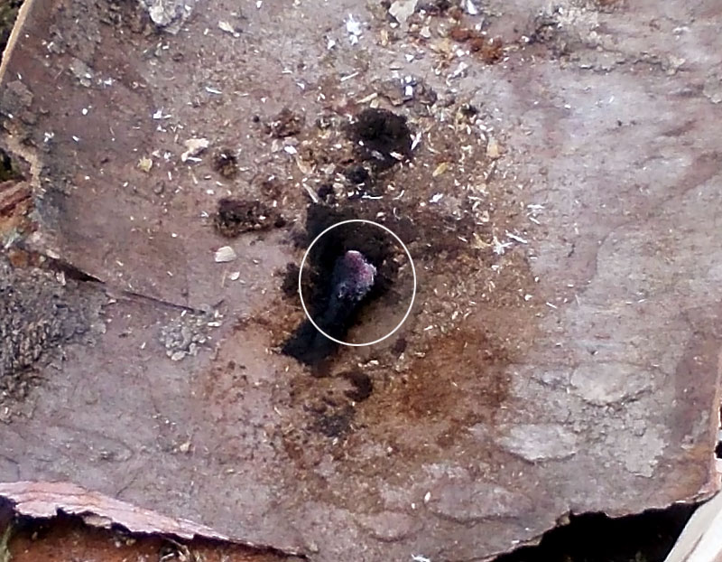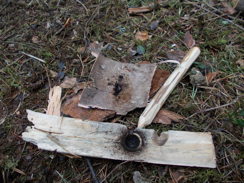 У нас тут дождь лил всю ночь и я думал, что ничего не выйдет. Ан нет. Подобрал относительно сухую ольховую ветку, которая уже слегка трухляветь начала (это необязательное условие, просто такая попалась), сломал ветку вербы, выстругал из нее сверло. Для верхнего упора отрезал березовую рогульку (там древесина плотнее) и проковырял сбоку небольшое углубление. Первая попытка была неудачной, т.к. я начал сверлить слишком близко к краю и после того, как сделал прорезь, сверло продавило очень мягкую древесину и начало соскальзывать. Неправильная лунка видна на втором снимке, она справа.