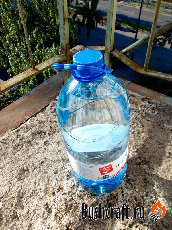 Берем пластиковую бутылку с водой. В данном случае - это пятилитровая фляга. Бутылка должна быть круглой, прозрачной и, желательно, с минимумом "украшательств" в виде декоративного рельефа в верхней части. Верхняя, сужающаяся часть представляет из себя большую линзу.