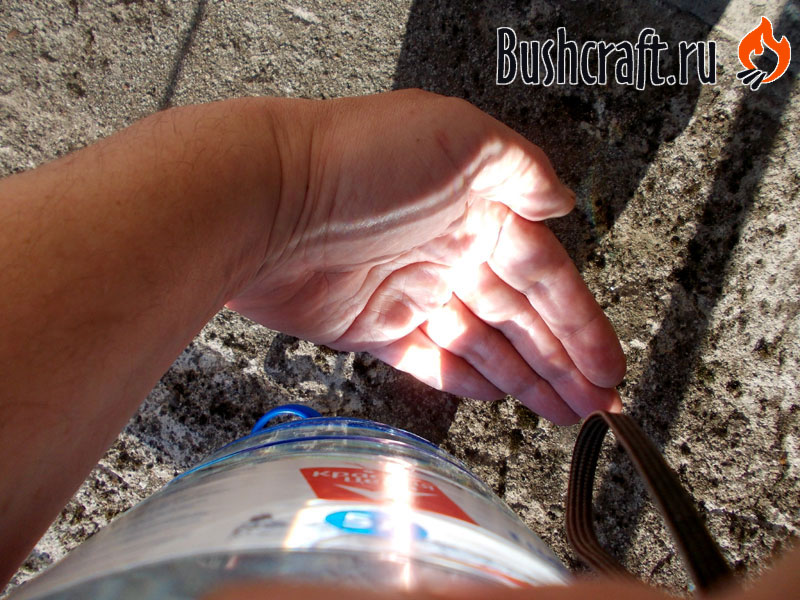 Переворачиваем бутылку, чтобы вода заполнила верхнюю часть. Ладонью ищем место фокусирования солнечных лучей. Как почувствуете сильное жжение, значит вы его нашли.