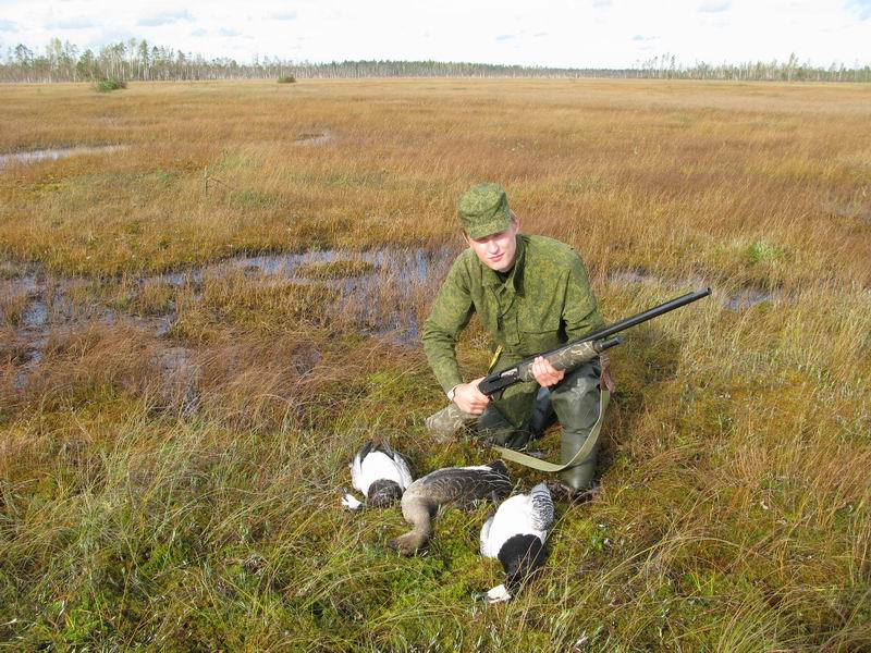 Крики гусей просто завораживали, стайки начали кружить над болотом и над нами, мы сидели и ждали когда они начнут снижаться! и вот первая стайка зашла на выстрел, вскочив и разрядив магазины из стайки выпал один гусь и начал снижаться, сел наверно метров в 400 от нас (еще нам показалось что и второй выпал, но намного дальше), я сразу побежал к нему, добежав до него метров на 30 он начал разбегаться и поднялся метра на пол от земли, но тут я его приземлил