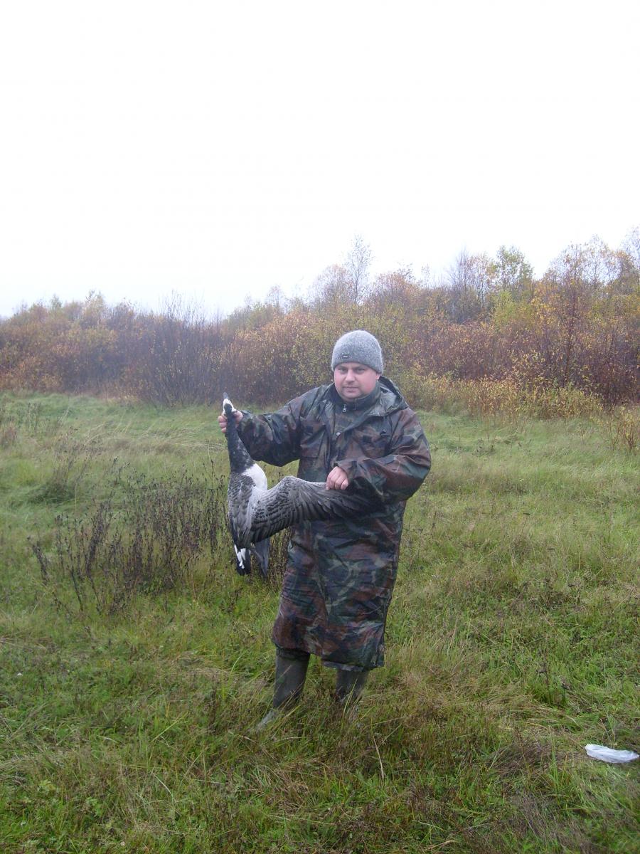 Дождь с утра начался за пол часа до будильника и непереставал всё утро. Было всего три налёта уток. Зато было два налёта гуменников. Из первой стаи, которая шла на высоте примерно метров 45-50, Ромка выбил одного и тот с перебитым крылом ушёл в траву метров за 300. А так как за забродниками Ромка поленился съездить к брату, а в болотниках дойти не удалось, остался он без желанного трофея. Эх, мать! Слов приличных на него нету. А вот по второй стае, которая шла в 3 эшелона на разной высоте, мы просто-напросто промазали. Два дуплета и всё мимо, а высота-то была метров 35 и прямо над головой. Эх, мать!! И так тоже бывает. Простояв до 11-00 основательно замерзнув и больше ничего не увидевши, мы решили закончить охоту и выдвигаться по неотложным делам в Пашу, а потом обратно в Питер. А дождь закончился как только мы въехали на КАД, вот зараза.....