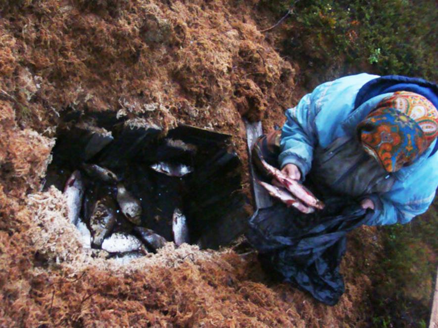 По дороге увидела следы костра, обложенные мхом. Первая мысль: зачем? Мох же быстро горит и огонь может распространиться вокруг. Мозгами понимаю, что ханты просто так ни чего не делают, значит так правильно, чтобы не попасть в просак, скромно молчу. Аркадий, видя что я разглядываю, объяснил. Он очень наблюдательный :)