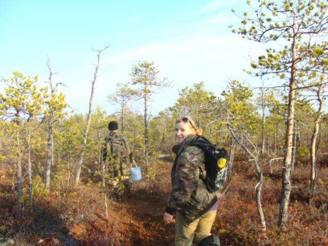 Шли мы где-то час, и если честно, выдохлись совсем скоро. Ну, не часто мы по болотам ходим. А может такое изобилие свежего воздуха наши легкие сразу принять не смогли. Аркадий летел на всех парах, будто по асфальту. Позже он сказал, что преодолевает это расстояние один минут за 17-ть :) Позор нам, позор! Где-то на пол пути наш проводник наконец сжалился над нами и объявил скорый привал. Причем он говорил, что через 10 минут придем. Говорил он так раза три.