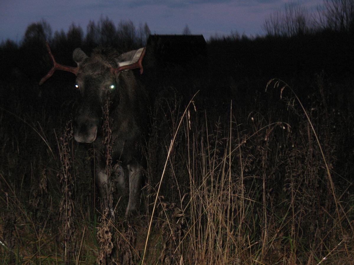В минувшую пятницу удалось пообщаться с одним лосем, пасущимся и кормящимся около дороги. Лось оказался весьма не робким и не пугливым, видимо, в силу своего малого возраста и малого жизненого опыта. Более того, он был с большими амбициями, и никак не хотел покидать место свой кормешки, пару раз даже делал попытки напасть(чесно говоря я сам нарывался). Впрочем, смотрите сами.