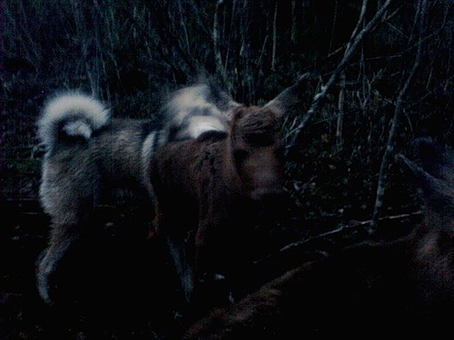 Фотка не четкая,конечно,на телефон в условиях плохой освещенности, затвор фотика с большой выдержкой сработал и за это время собака повернула голову(смотрела в право,повернула на лево),а холка-то на месте осталась.Может чё-то и произошло-бы,но хозяин,сделав пару снимков,быстро увел ошалевшую собаку,которая никак не могла врубиться и разобраться что это такое.