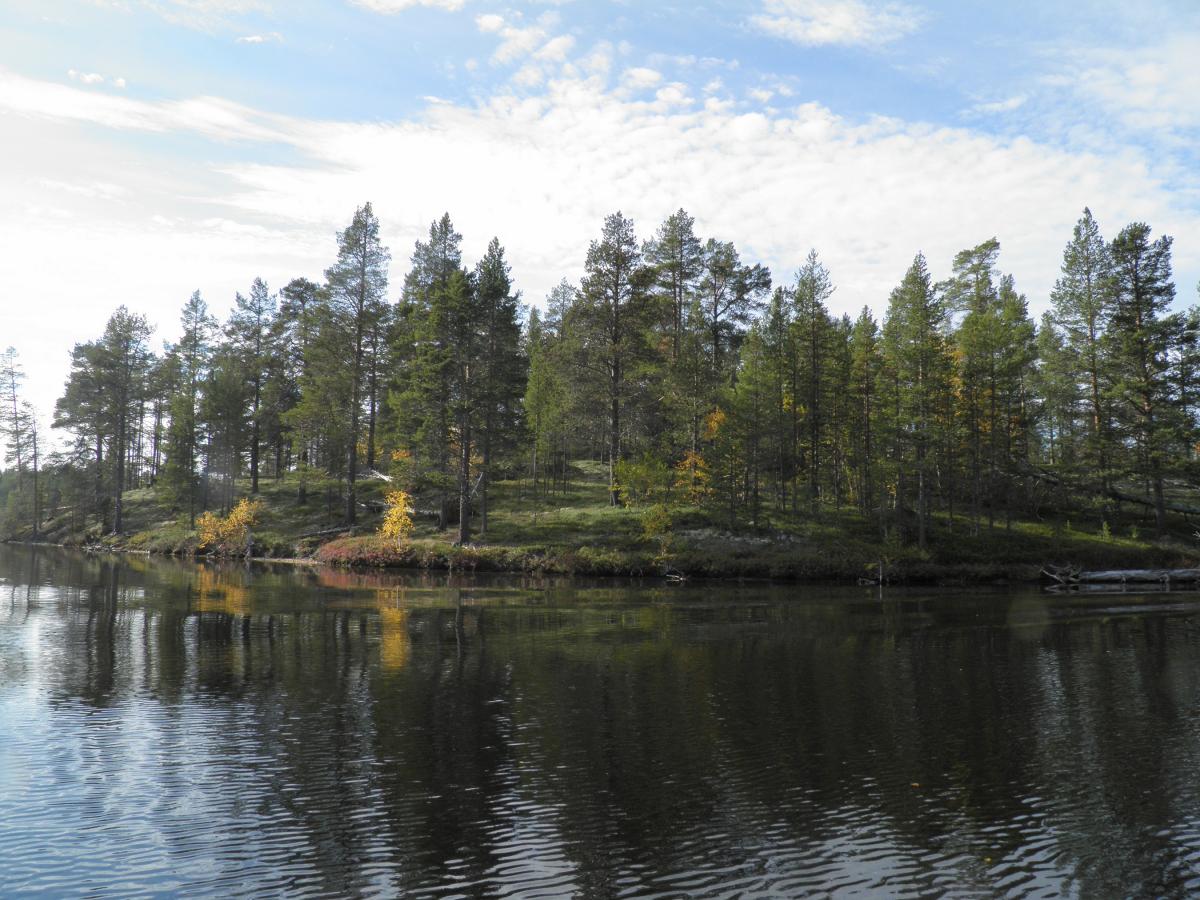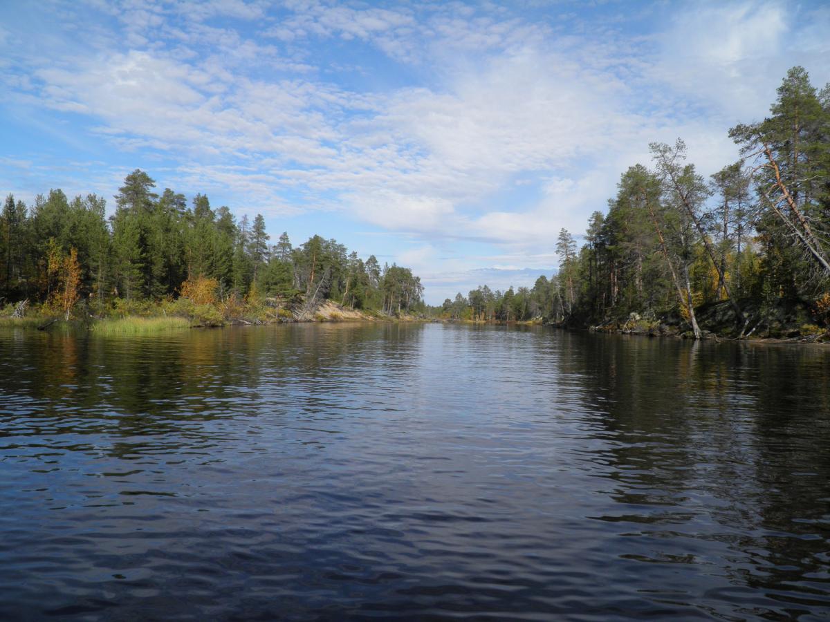 Эти фотографии сделаны в начале сентября на выезде к нашей избе. Погода первые два дня была совершенно удивительной для наших мест в сентябре: +27, солнце и полный штиль. Собирались что-то долго, выехали поздно, да ещё поехали через Заполярный и Никель, мотор лодочный у знакомых забрать надо было. Соответственно, прибыли в Приречный уже к 16 часам. Это по дороге: