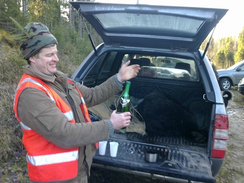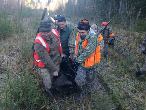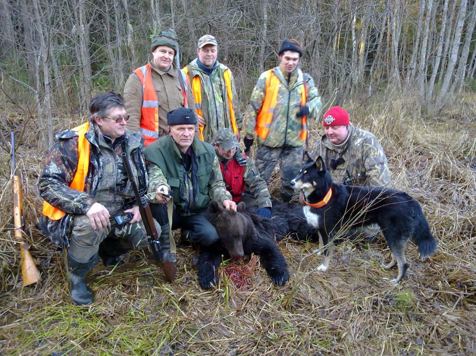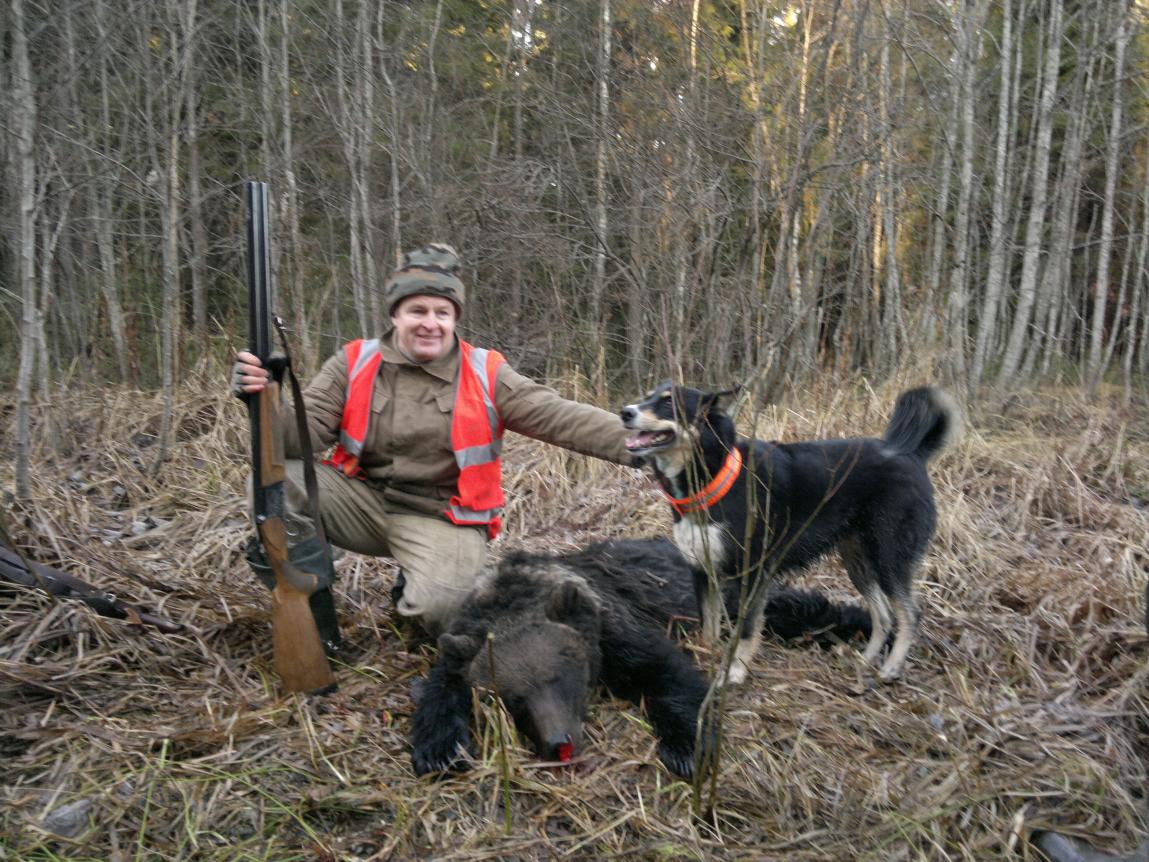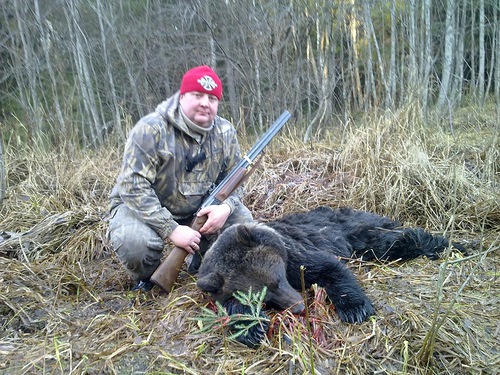 Трава похрустывает (ночью был небольшой морозец), солнышко светит, небольшой ветерок вдоль стрелковой линии. Выставились, осмотрелись. Пока последние 2 номера шли к месту, оптоптал траву, обломал лишние ветки березовой поросли, чтобы не мешали. Место интересное – низинка, впереди слева небольшое открытое болотце, зажатое с двух сторон пригорками с крупным ельником, прямо как в фильме «Особенности…»: «Там распадок, туда встань, зверь там пойдет тут ты его и …!». Встал на противоположной загону стороне. Начало загона не услышал – в низине за пригорками звук глушился, да и расстояние было больше километра. Прямо передо мной проход на пригорок по канаве, заросшей мелколесьем – это и есть тропа и зверей и грибников/ягодников. Прошло совсем немного времени, как слева метрах в 100 раздался резкий звук двух сломанных веток и буквально через несколько секунд в дальнем просвете мелькнул зверь. Быстро поднял ружье и снял с предохранителя. Кабан – пронеслось в голове. Тут же с соседнего номера начали стрелять. Когда зверь мелькнул во втором просвете метрах в 30-ти от меня, стало понятно, что этот «кабан» бежит слишком тихо и не по-кабаньи. Ружье у плеча, стволы направлены в сторону перехода через канаву – стало понятно, что в загоне медведь. Прошло не больше 3-х секунд (галопом зверь шел, что до выстрелов, что после), за которые мишка (уже понятно было, что это именно он) пролетел 30 м и выскочил в 10 м от меня на открытое место в штык. Скорость мысли была космической: делает прыжок в мою сторону – на втором прыжке стреляю за ухо в холку/шею/лопатку; уходит вправо от меня – стреляю по лопаткам. Мишка поворачивает вправо от меня – наверное отпугнул непонятный предмет с красными полосами – и уходит галопом через газопровод. На втором прыжке (первый был совсем короткий) бью из нижнего ствола 43-грамовой диаболо. Медведь в прыжке переворачивается и с ревом и рыком падает в траву, из-за которой видна только его холка. Приподнимается голова, ловлю на мушку, но не стреляю – голова падает на землю и мишка издает уже слабый рык и бьется в последних конвульсиях, приминая траву. Чтобы не портить шкуру, выжидаю момент, когда он повернется ко мне мордой и вторым выстрелом (Полева 6) добиваю в основание шеи. Все...От момента мелькания в первом просвете до второго выстрела прошло не более 15 секунд. Лицензия закрыта, первый в охотничьей жизни мишка взят. Махаю соседнему номеру, что зверь дошел. Перезарядился. Собака в загоне идет с голосом, загонщики воодушевились, жду, вдруг еще кто-то выскочит. Минут через 15 выходят загонщики, все собираются у трофея ,поздравления и персональные и коллективные, фотосессия, вынос трофея к машине, шампанское «на кровях».