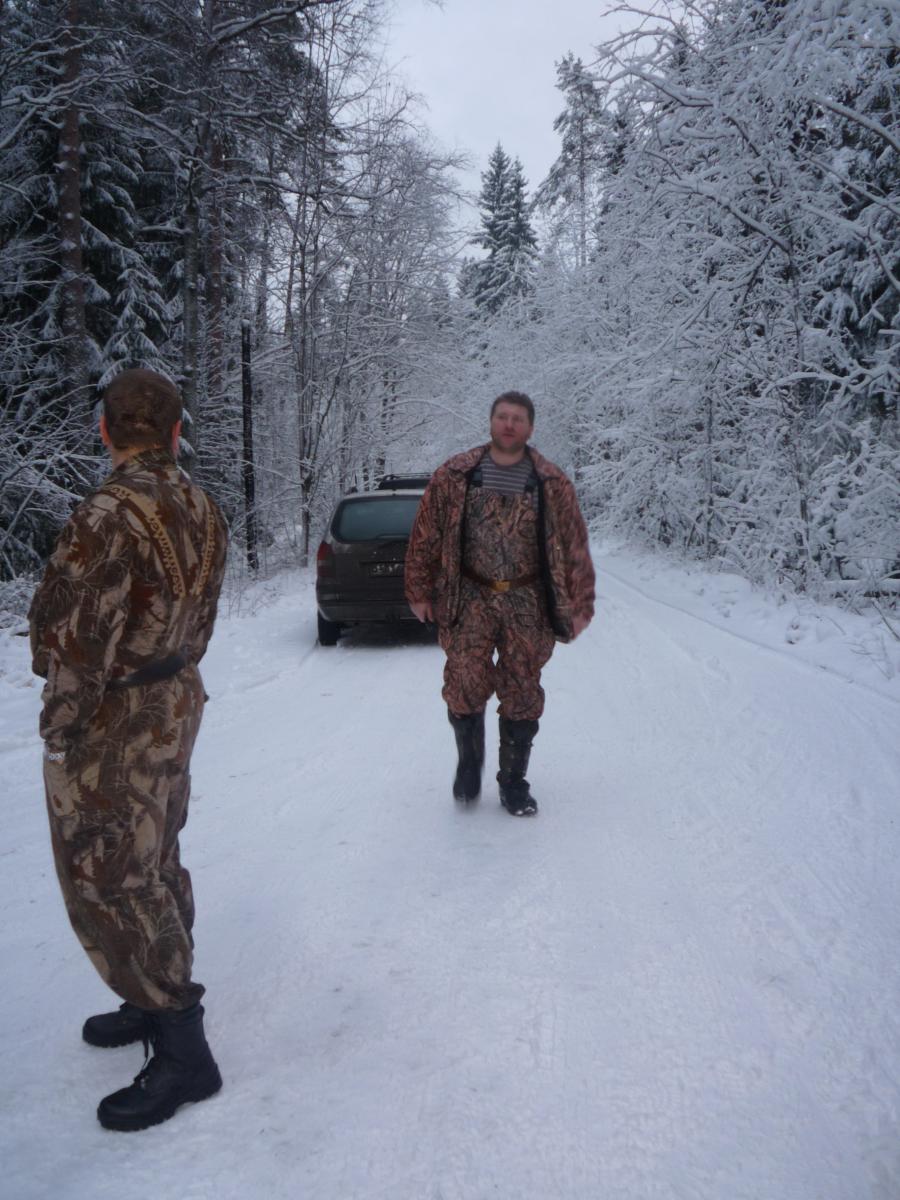 Первый выстрел-промах !! Второй выстрел-цель достигнута! Это уже потом выяснилось. Думал промахнулся,т.к. стрелял через ёлки и кусты. Меня охватило не приятное чувство промаха!!! Муторное ожидание егеря,в голове не перестовало жужать,а вдруг промах,а ещё хуже подранок!!??