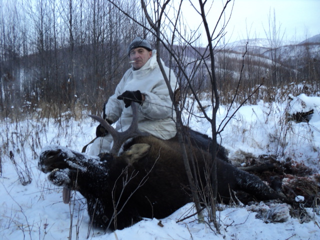 Посмотрели друг на друга, разом сказали ДА!!! Пора изучать поварскую книгу, а не на охоту ходить, это когда такое было чтобы на 300 метров промазать, стареем однако! Идём дальше, подошли к перевалу в ключ, рация зарабола, передают-Николаич! -сохатые пробежали вокруг этой ху....ни и пошли в обратную сторону! мы с Колей чуть со смеху не упали, говорю-объясните толком, про эту ху...ню поподробней. Второй раз получили понятные подробности. Прошло минут 10, опять выходят на связь,-Видим в распадке сохатого,расстояние около километра, идите к нам. Передаю Коле рацию,-на пообщайся! Он им говорит -Мы далеко, пробуйте подходить. Пол часа тишина, и началась стрельба, стреляли хорошо, громко. Лёха выходит на связь-Стреляли по двум сохатым, одного не вижу, второй пройдёт метров 30 и останавливается, осталось 2 патрона, у Саньки патронов нет. Немного погодя, выстрел, через минуту ещё один. Коля говорит-Всё, у них патронов больше нет. Минут через 10 , Лёха телефонирует-Один лежит живой, добивать нечем. Что делать, надо идти, я пошёл добивать, Коля за вездеходом, уж слишком далеко нам возвращаться к вездеходу, через час уже темно будет. Минут через 30-40 подошёл к сохатому, добил, тут и Лёха с Санькой подошли-"Виновники торжества" . Говорят-Мы к нему подходим, а он давай вставать, так у нас всё сжалось так, что иголку не просунешь, мы быстренько бежать от него! Да и не мудрено, у него 4 кулака и на каждом кастет, есть чего бояться.