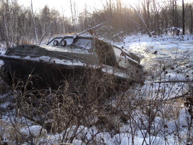 В 300 метрах от зимовья стали переезжать речку и провалились, ни в зад ни в перёд. В зади лёд на уровне задней двери и ещё вода сверху пошла, а спереди берег крутой, гусянки скользят по мерзлоте. В салоне вода, вентилятор цепляет воду, трос есть, но лежит около задней двери, а там воды под самую крышу. Что мы только не делали, и лёд пытались пилить стоя в воде, и берег топорами рубили, всё бесполезно. Лёшка сходил к зимовью притащил трос на 22, метров 6, распустили его пополам по 3 жилы, с большим трудом завязали петли (не гнётся, в витках проволока толстая) . Рядом ни одного нормального дерева, не за что трос привязать, только растут 4 берёзки с одного корня, и те не больше 60мм в диаметре, выбора нет, привязал за них. Потянули гусянкой, петли затянулись, вездеход начал выползать на берег, выдержали и берёзки, и 3 жилы гнилого троса, а то пришлось бы бросать вездеход в речке до весны. Так и день прошёл, в 11 провалились, в 9 вечера зашли в зимовьё.