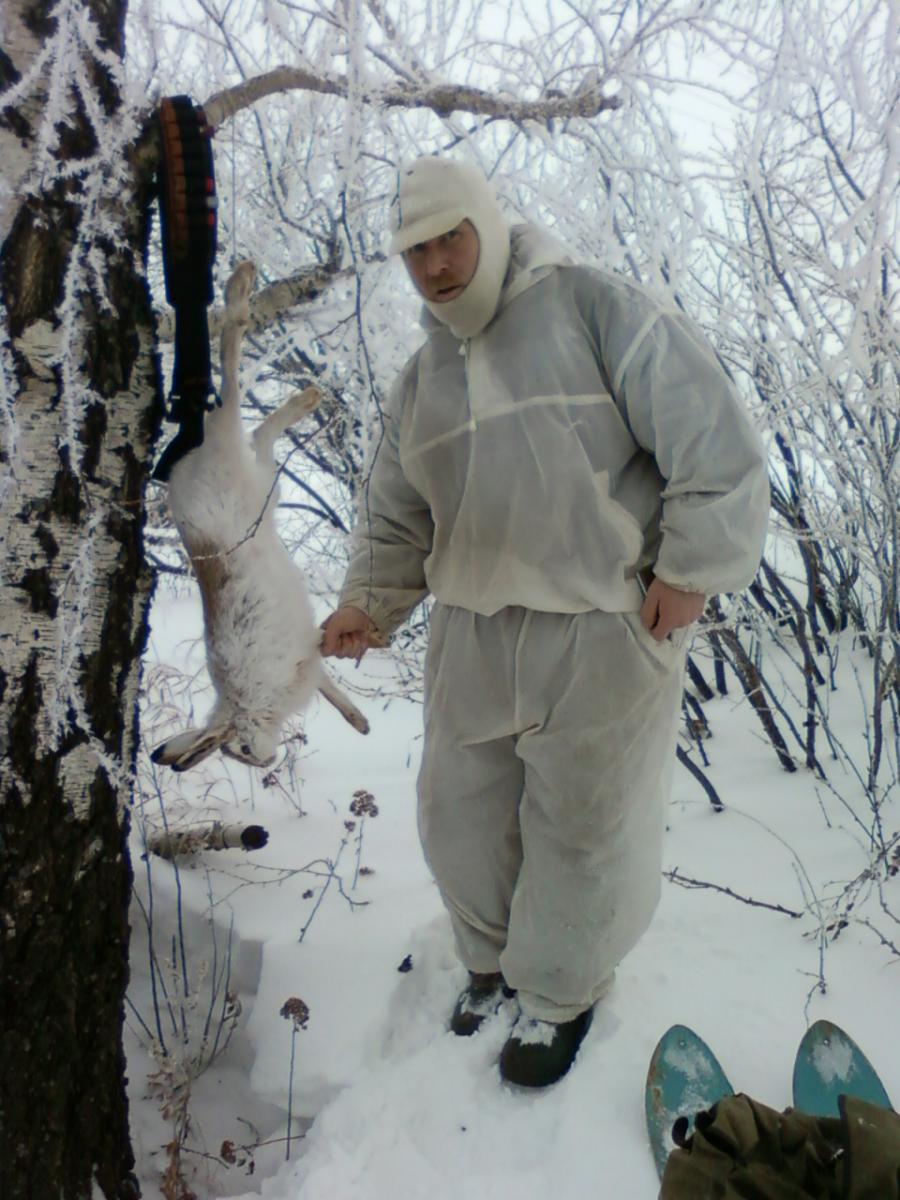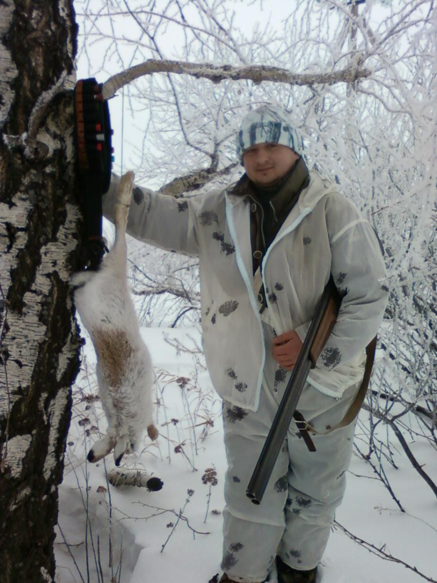 Доброе всем время ! Пришло время отвлечся от Новогодних праздников и выгнать из организма все,что он перетерпел за эти будни ! Утро было очень даже спокойное ,морозное и солнечное. Порой над посадками нависал даже туман,но он никак не помешал,а наоборот даже очень помог в подходе и скрадывании...Но несмотря на все эти положительные факторы,остаться незамеченым,так и не удалось...Изрядно погоняв нас по посадкам и полям,нам все же удалось добыть его-ЗАЙЦА 2012 !!! ПОЛУЧИЛОСЬ ВСЕ КАК ТО ВНЕЗАПНО,к тому моменту я уже находился на другом конце посадки,где находился в ожидании зайчика,так как косой был замечен в ней...Друг пошел толкать его на меня,а он развернувшись,пошел прямо на него,чуть ли не сшибая его с ног...Раздался дуплет,но заяц все продолжал движение набирая обороты...Дойдя до места первого контакта дроби со снегом,стало ясно,что его не зацепили...до второго выстрела не стали продолжать движение,так как видно было,что заяц остался цел...Решили пройти соседние овражки,а уж потом подолжить движение по стреляному зайчику.В других местах были следы обитания косого,но его там не оказалось...Пришло время выдвигаться в сторону дома,по пути проверив того,уже стрелянного...Как оказалось,он прошел еще порядка 100 метров на махах и лег под березой...ДОШЕЛ...Зацеплен был всего одной дробиной и как показало вскрытие-прямо в сердце !!!