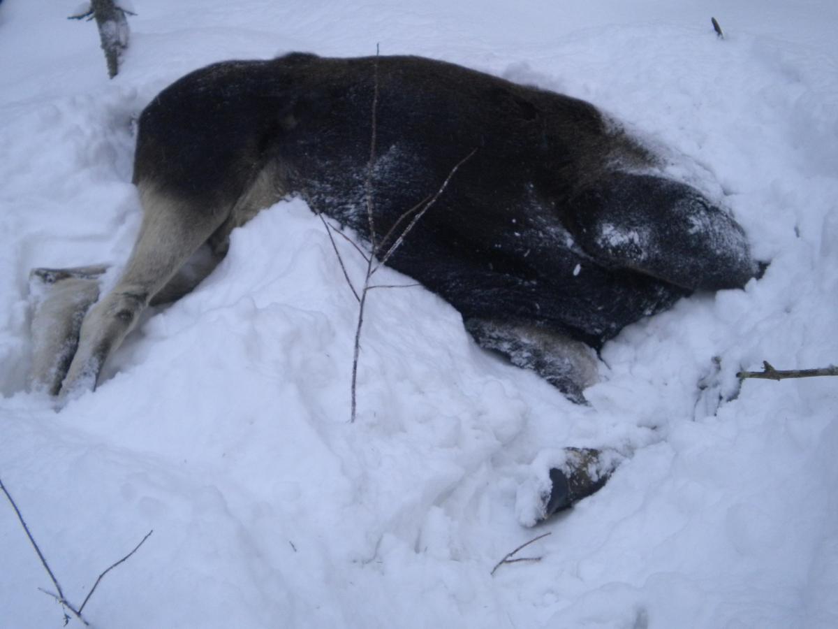 На пределе видимости проглядывается коричневое пятно. Лось или выворотень? Всматриваюсь секунд 30. И вдруг вижу взмах рогами, лось!!! Днем кормится! Обдирает пихтач, рога вижу, идет движение вверх, вниз, но стрелять не могу, не уверен, что видимое пятно это корпус зверя. Прислоняюсь к дереву и начинаю ждать. Признаюсь, что впервые увидел зверя на кормежке, обычно стрелял уже на лежке или в поднявшегося с нее. Минуты ожидания тянутся томительно, досчитал до пяти, второго лося не вижу, он еще дальше, но ведь может и обойти меня сбоку и все: конец охоте. Одно мгновение и зверя больше не увидишь. И тут лось зашевелился. Стреляю по вздрагивающему силуэту, целясь, как бы и хотелось под лопатку. После двух выстрелов наступает оглушительная тишина. Ничего не движется, стрелять больше не во что. Выждав паузу, начинаю подходить, держа оружие наготове. А Лось так остался лежать в снегу с зажатой в зубах пихтовой веточкой.