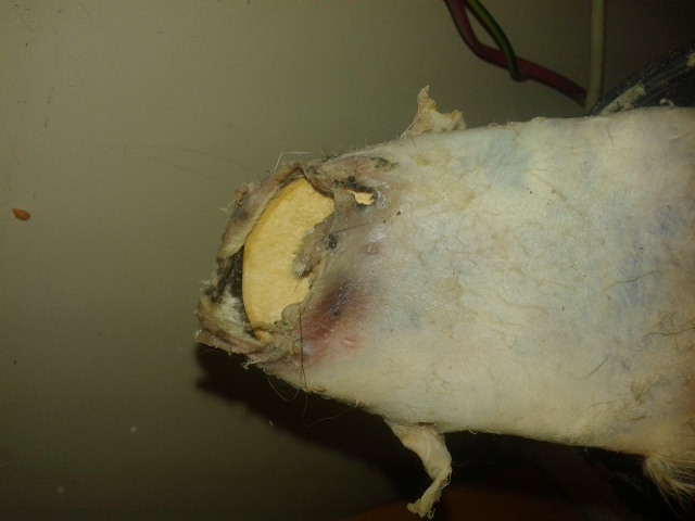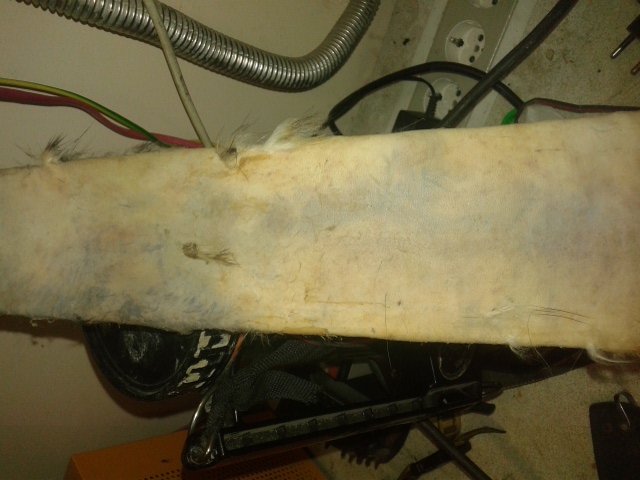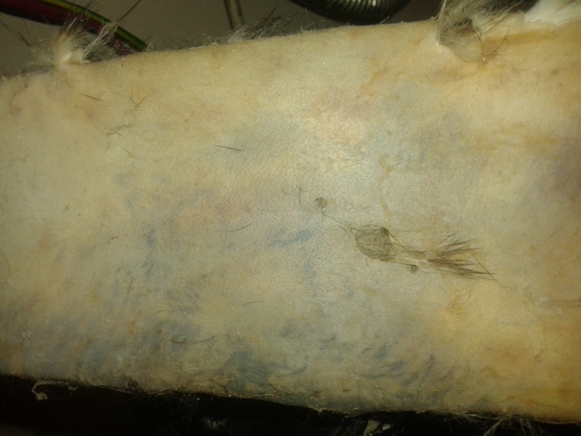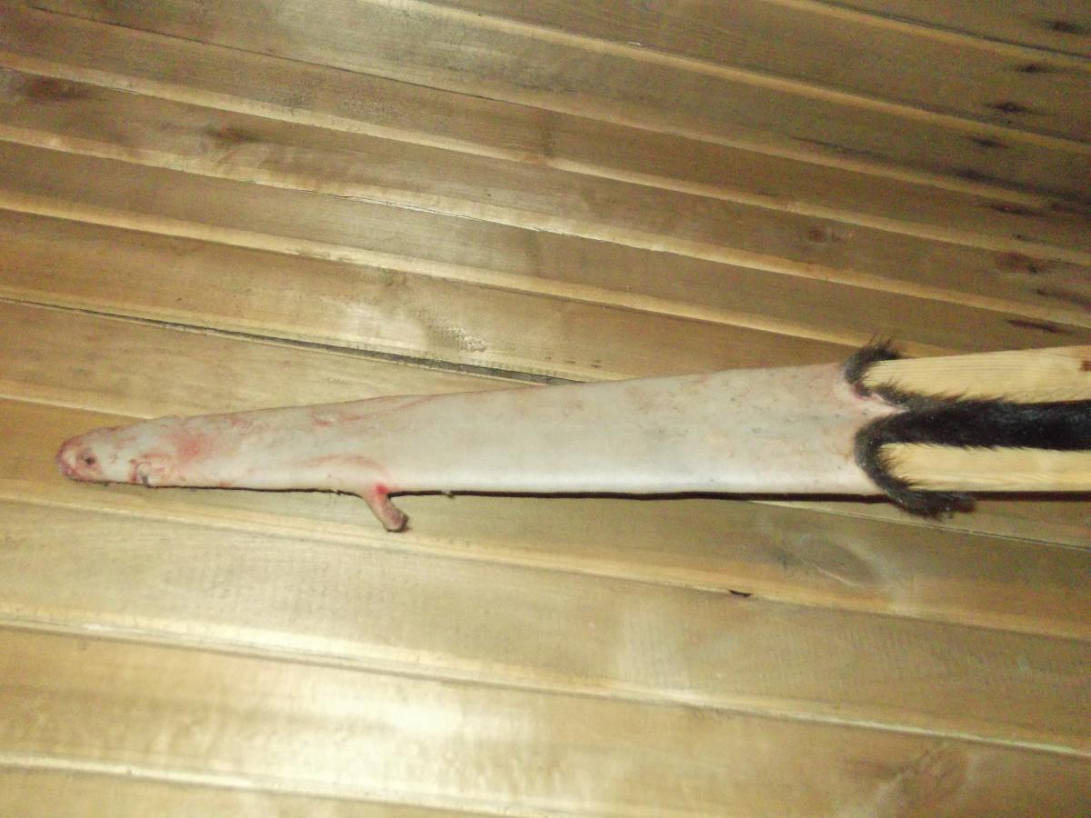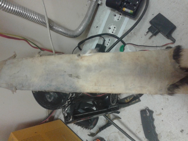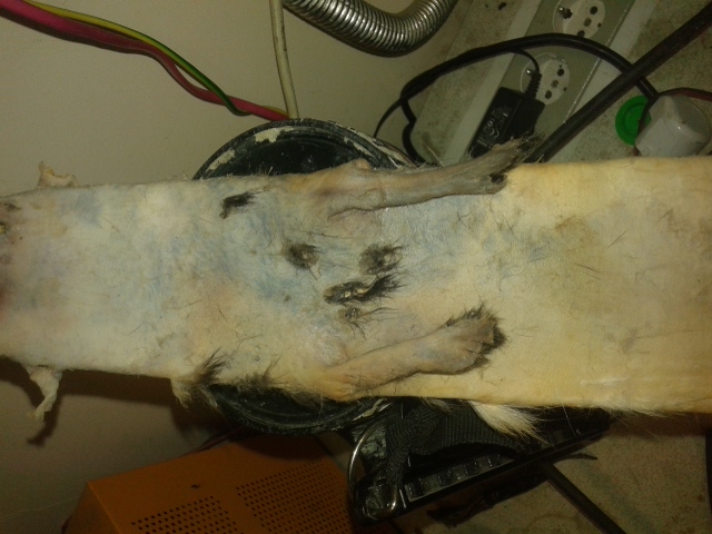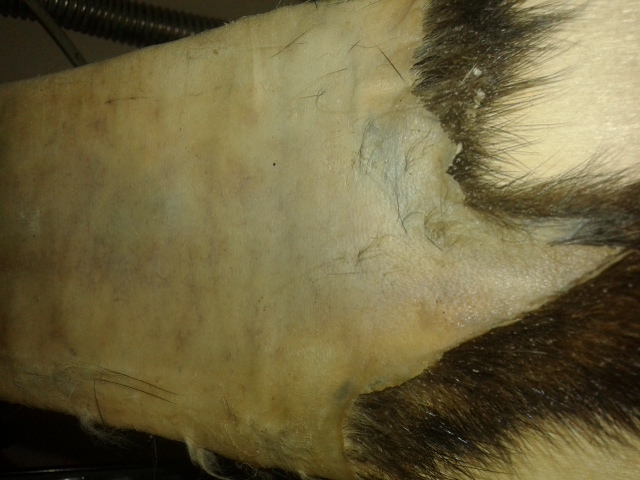 Ну и особенности шкурки, как ты правильно заметил. Ведь толщина шкуры не равномерная. На твоей фотке видно, что ты перестарался в самом тонком месте шкуры - между передних лапок, на грудке. Там особо мездрить и нечего, а ты приложил лишние усилия.