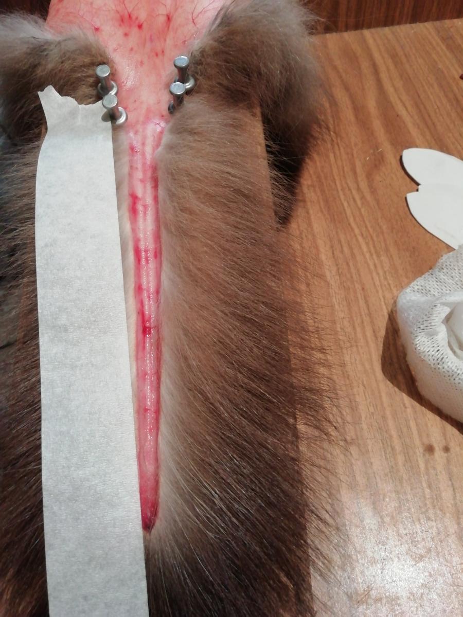 Теперь подтянув шкурку, выравнеиваем задние лапки по пялке и закрепляем их.