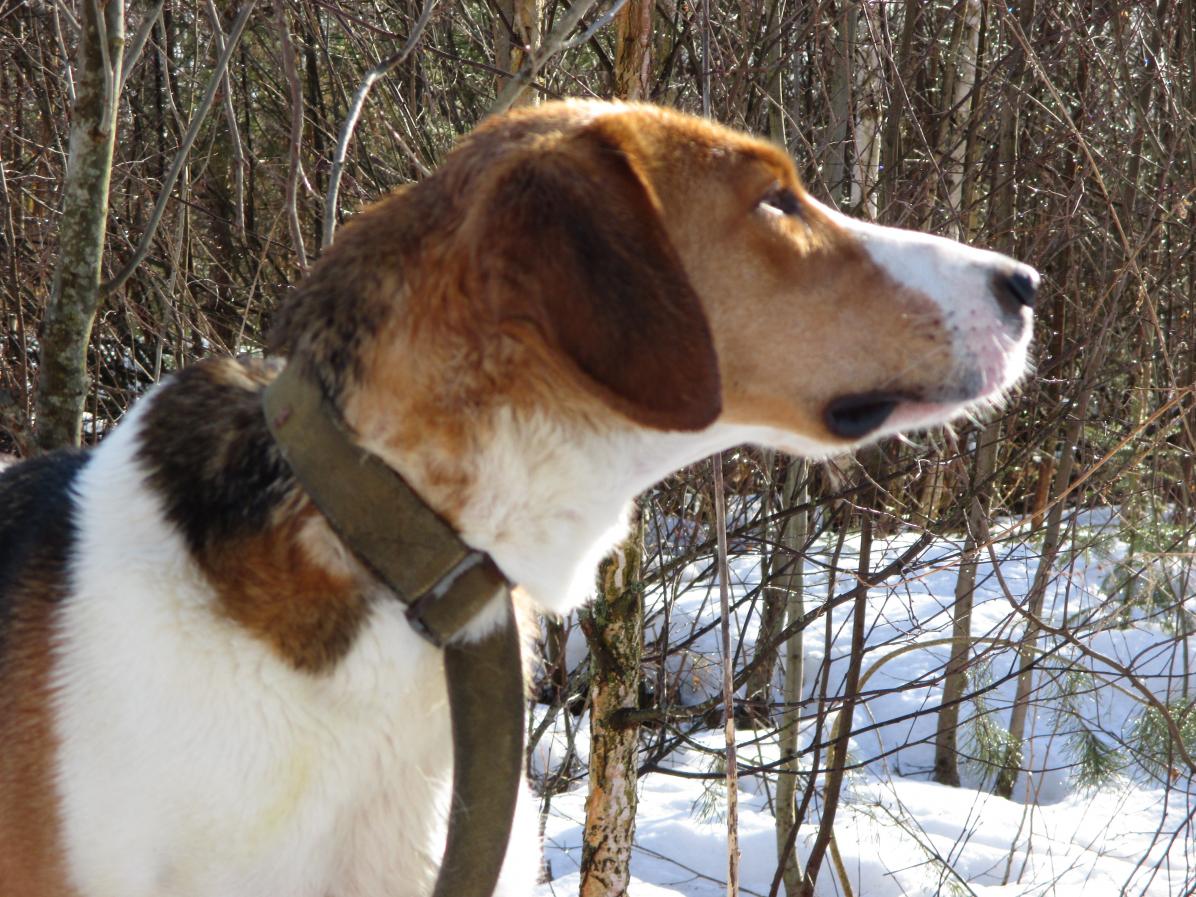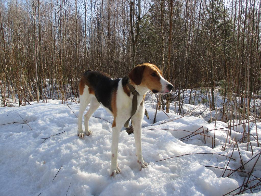 Погоняли вчера немного. Подняла поздновато уже в 11 часов. Но гон был хороший, постоянно на слуху, зайчик ходил кругами. Правда были пара досадных сколов минут по 7-10.