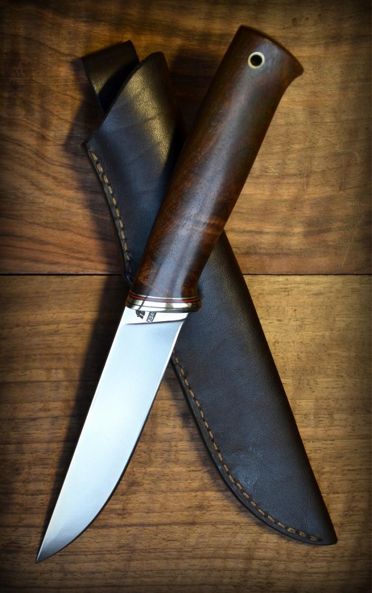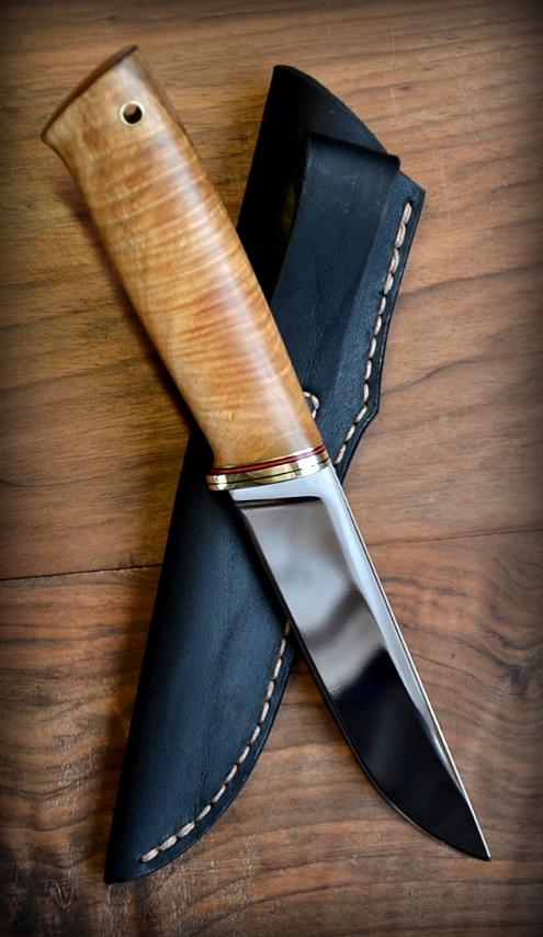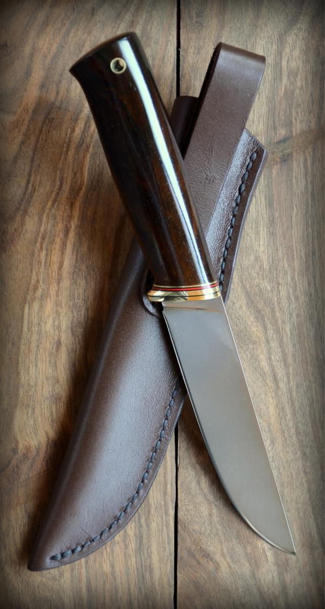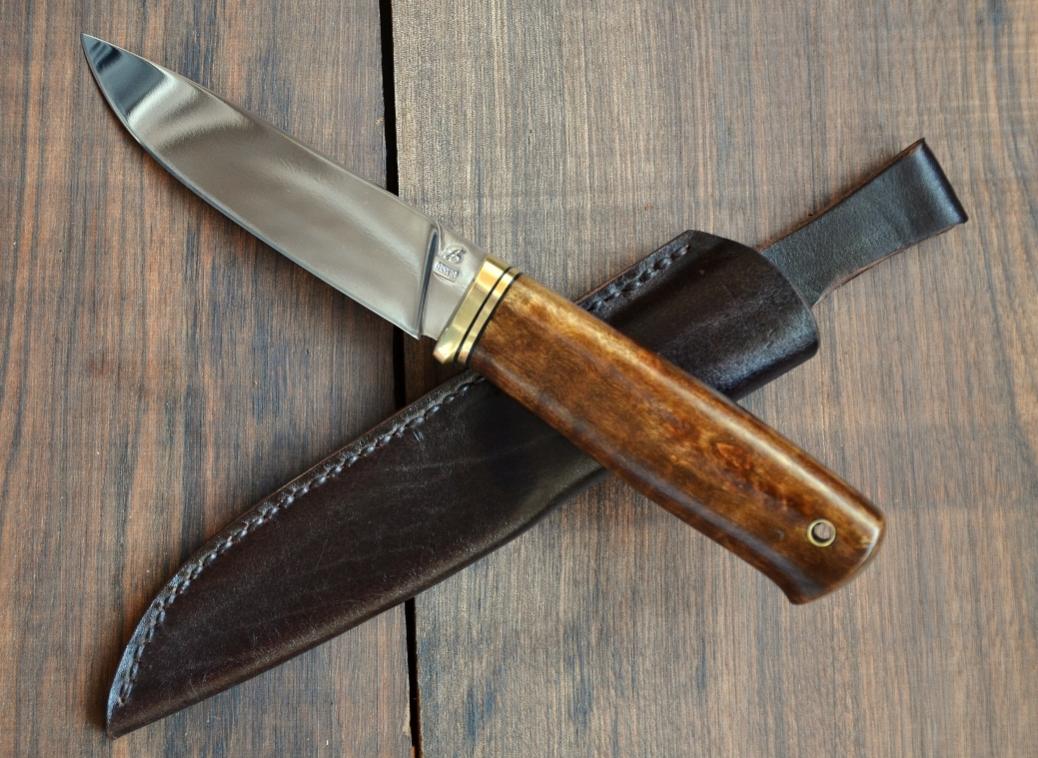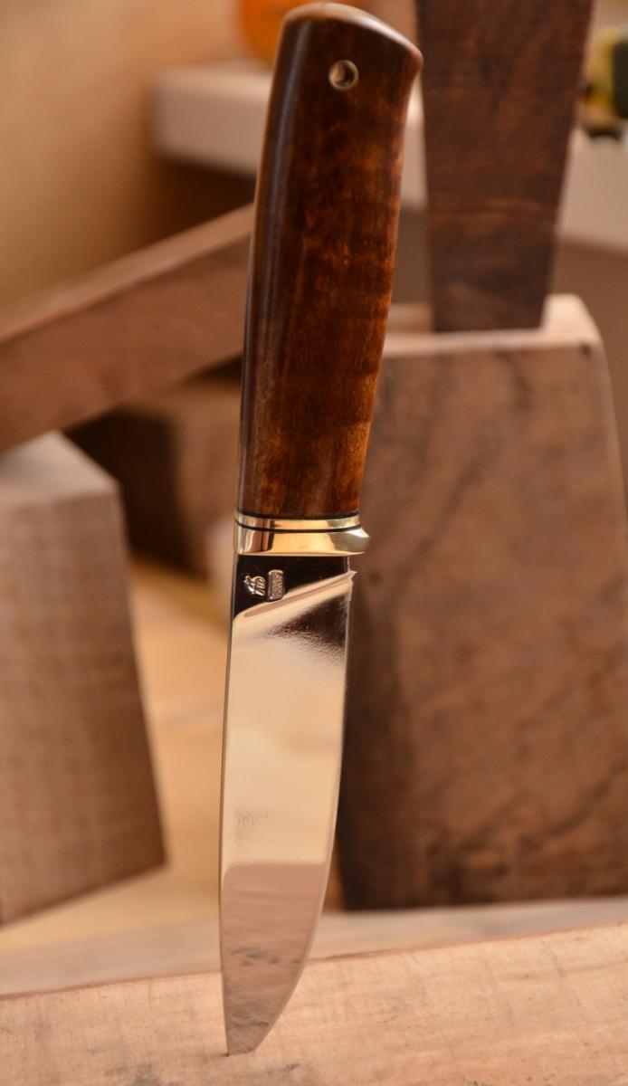 Рукоять традиционно орешек, 120мм по обуху, пропитана нат. льняной олифой. Больстер латунь+фибра.