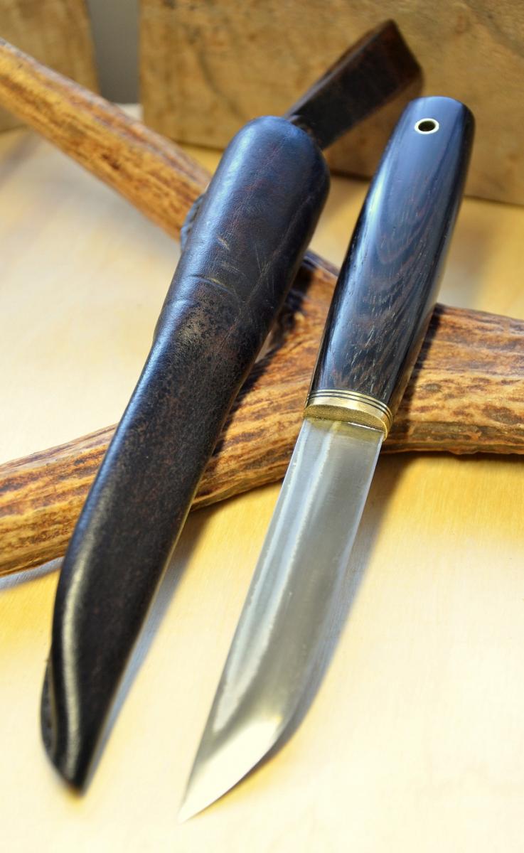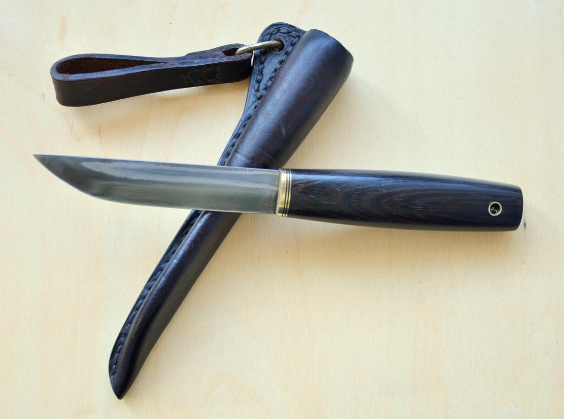 Ножны кожа 4,5мм. Подкрашена, пропитана. Получился такой крепыш, очень удобный в руке. Нравятся мне рукояти из рога.