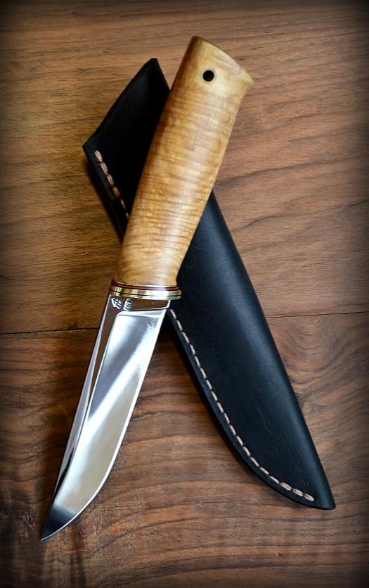 Клинок А.Бирюкова, сталь BOHLER К340, твердость 62-63ед.с очень высокой ударной вязкостью. Вот здесь Андрей об этой стали http://www.youtube.com/watch?v...player_embedded Итак ТТХ: Клинок 124*26*3, полированный пескоструй, заточен.