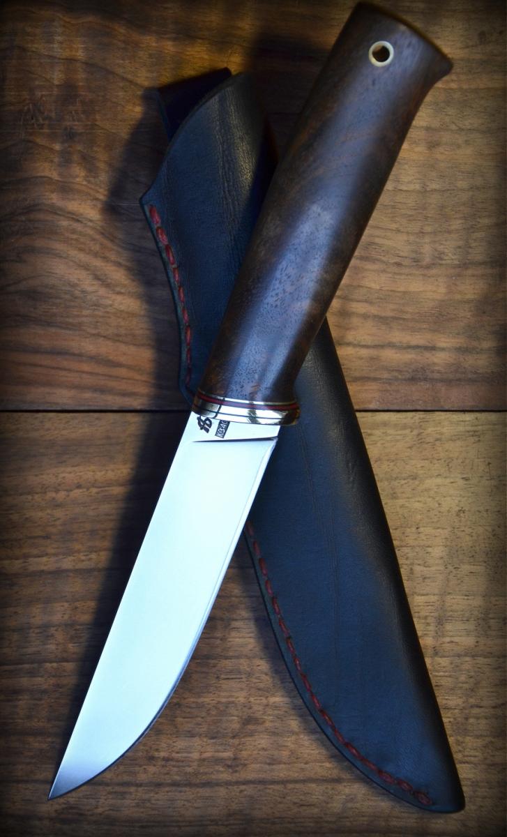 Клинок А.Бирюкова, сталь Bohler к340, твердость 62-63ед., полированный пескоструй. Состав:С 1.10%, Mn 0.40%, Cr 8.30%, Si 0.90%, V 0.50%, Mo 2.10% + добавки. Вот видео с сайта Андрея про эту стальСталь К340 средний.mpg - YouTube