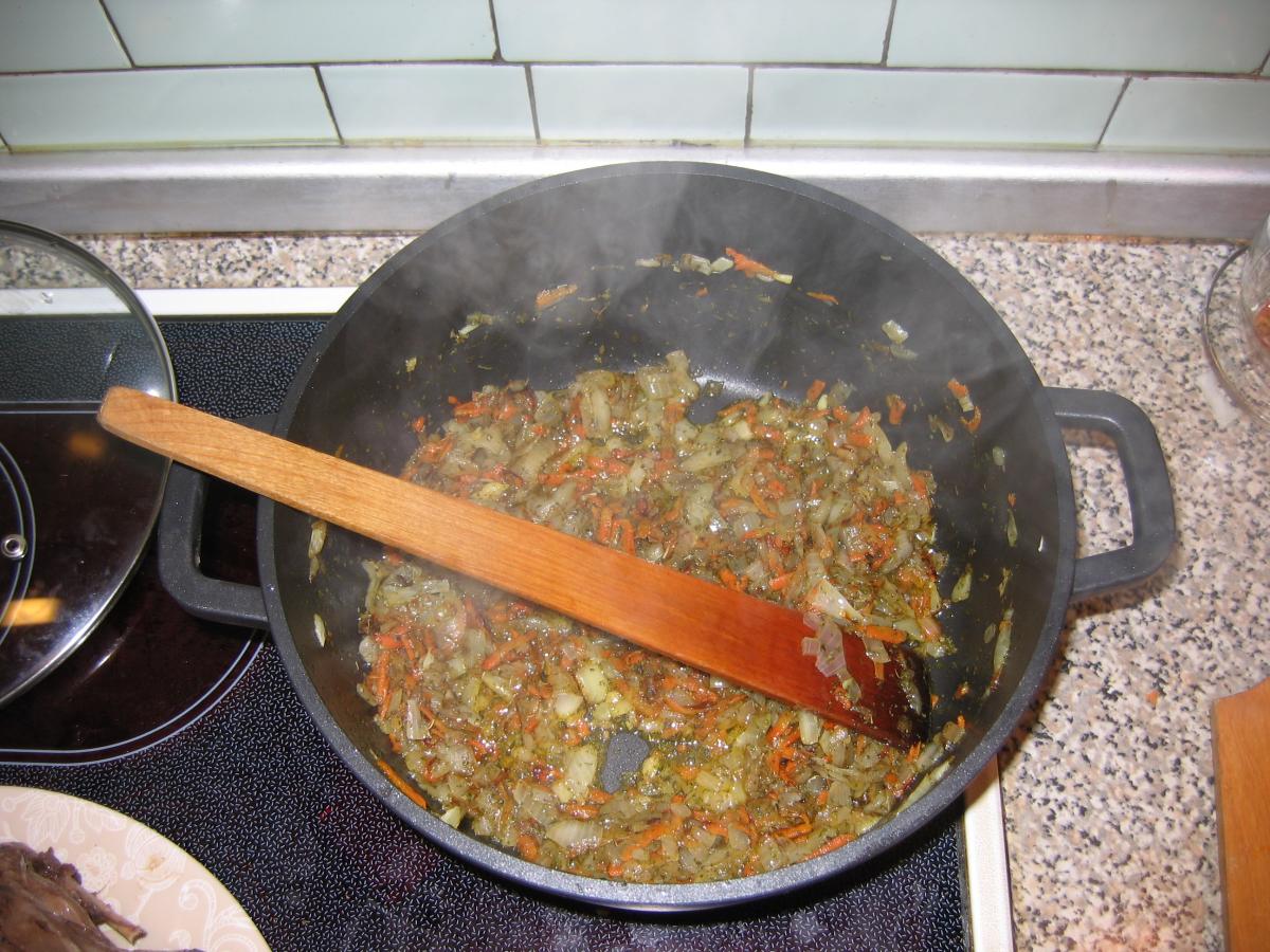 Пока нырки жарятся чистим лук и мелко нарезаем его, чистим морковь и натераем её на крупной терке. После того как нырки обжарились, вынимаем их и кладем в кастрюлю (сковороду) в которой жарились нырки натертую морковь и обжариваем её. Как только морковь слегка обжарится добавляем нарезанный лук.