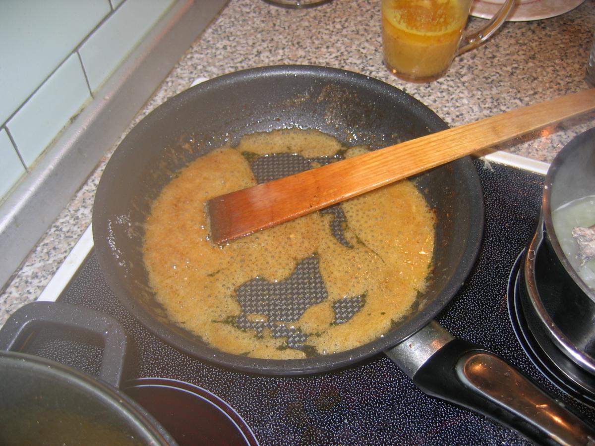 Разогрейте сливочное масло в сковороде, когда растает, насыпьте в сковороду сахар и постоянно помешивая дайте сахару карамелизироваться (станет по цвету похож на кофе с молоком). Жечь сахар не надо. Иначе вкус будет горький.