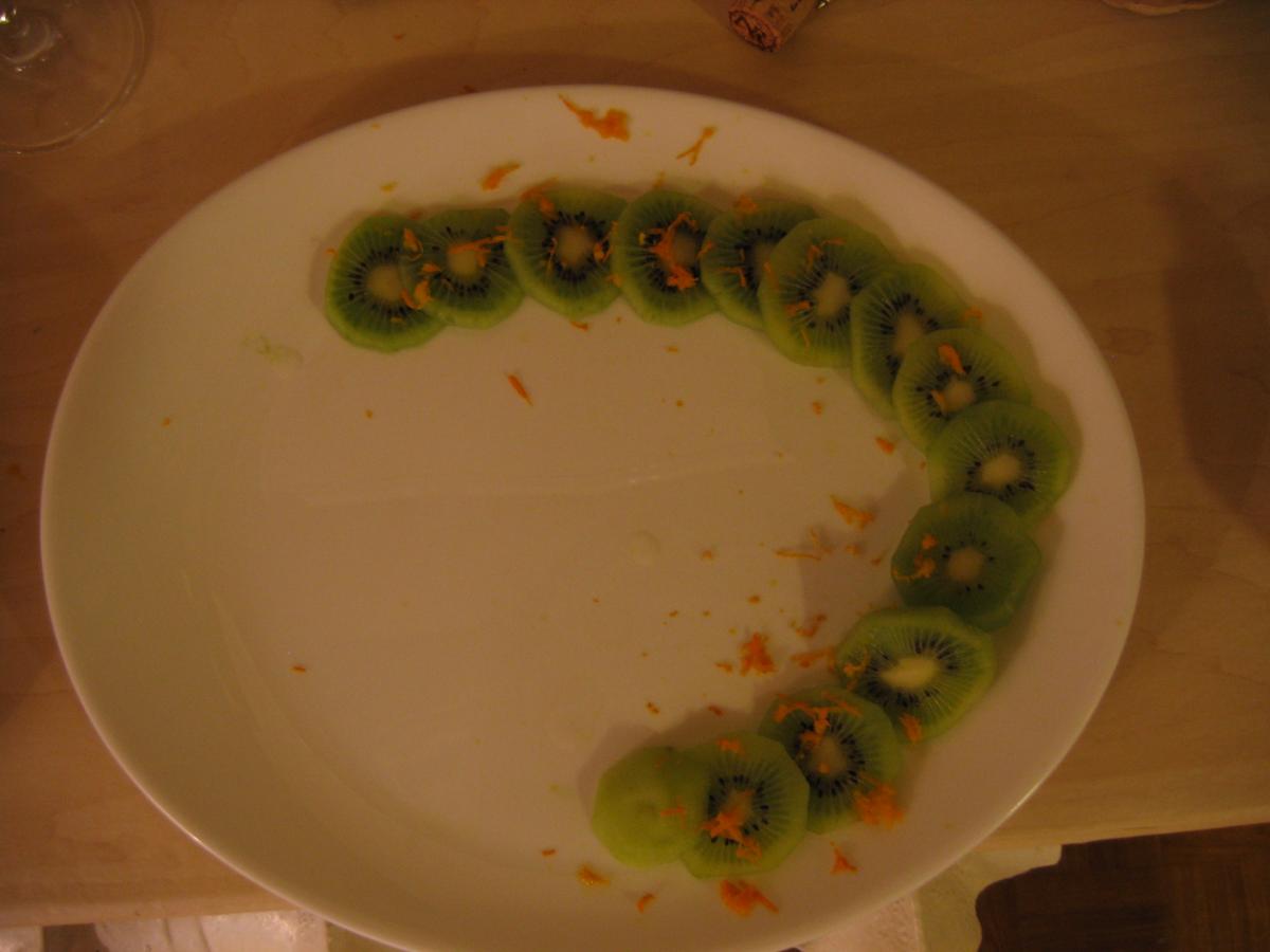 Пока рябчики тушатся, очистите от кожуры киви, нарежьте тонкими ломтиками и украсьте ими тарелку. Сверху на мелкой терке натрите цедру с половины апельсина.