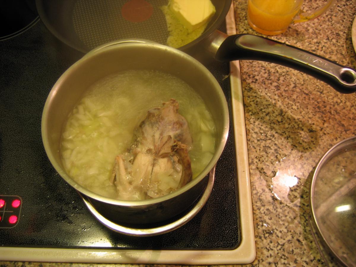 Пока рябчик отмокает, почистите и мелко нарежьте лук. Выньте рябчика из молока, положите его в кипящий куриный бульон, туда же добавьте порезанный лук, убавьте огонь до минимума и тушите с закрытой крышкой 50 минут. Можно обойтись без соли или добавить её совсем чуть-чуть.