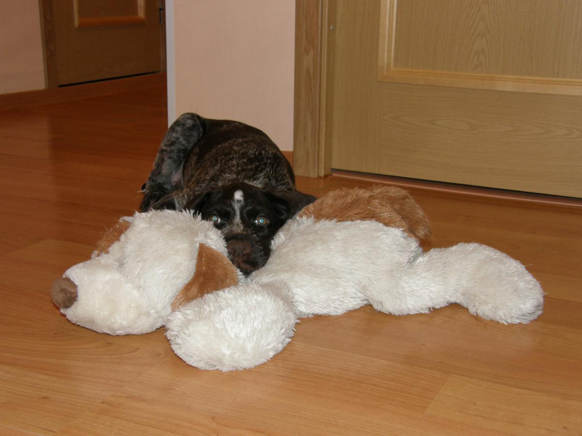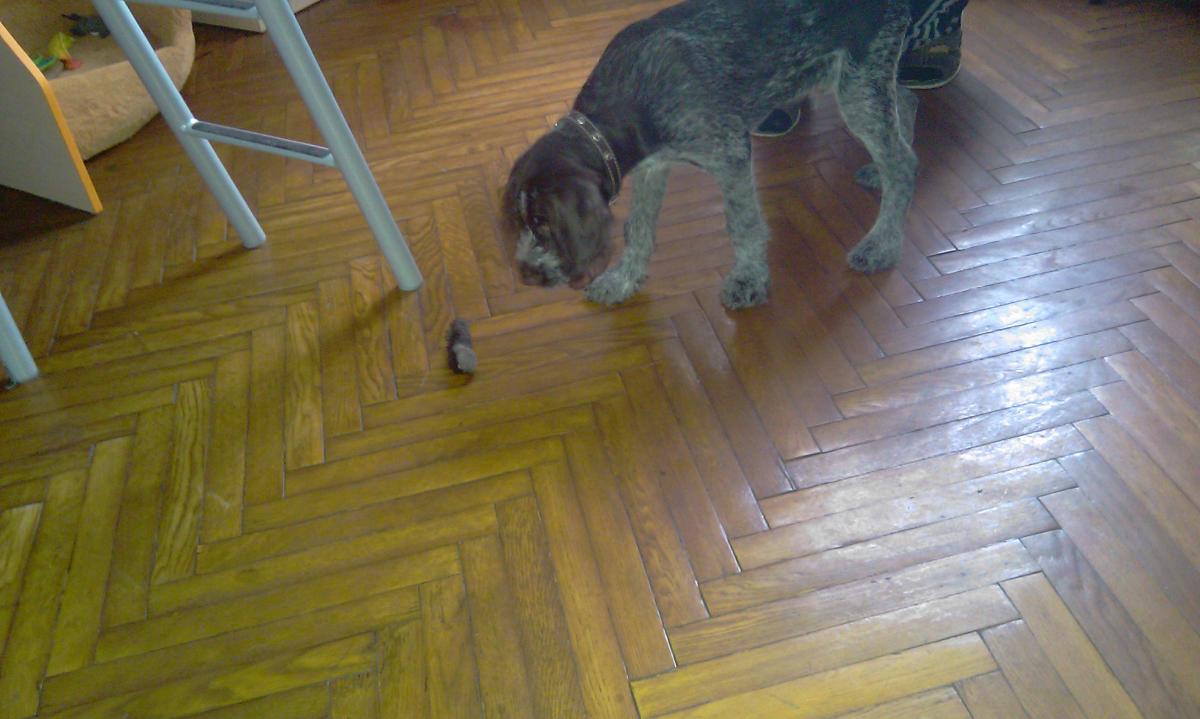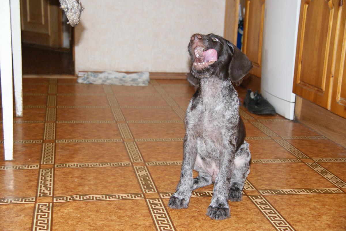Но есть и прогресс: знает и почти всегда выполняет команды "ко мне", "сидеть". Кушать начинает только после команды "возьми", а пока ждет её, то терпеливо сидит около миски. Писает и какает преимущественно в коридоре. Эх, скорей бы на улицу!!!