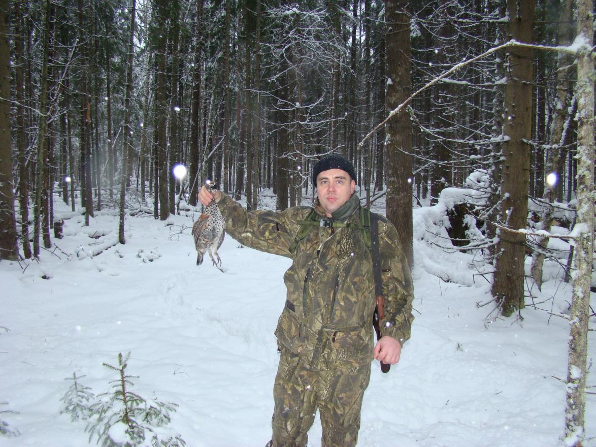 Проходим с километр в глубь, делаю пробный свист - чу, откликается! Не торопясь пересвистываемся минут пятнадцать - но рябчику хорошо, рябчик не хочет лететь на разборки с непонятными соперниками. Когда рябчик не идёт к охотнику, охотник идёт к рябчику, решил я и не торопясь двинулся в глубь. Десять метров прошел - пять минут подождал, свистнул дождался ответа и снова тихонечко на голос. Вот уже, где-то совсем рядом он должен быть и только слышу впереди фррр крыльями - перелетел с ветки на ветку, но неудачно - сел прямо за ствол, не вижу его! Начинаю сближаться, место приземления на мушке, прыг - рябчик в зоне видимости - бах - уже вижу что попал но всё-таки досылаю БАХ контрольный!) Бегу к месту падения - и вот он, красавец на снегу!