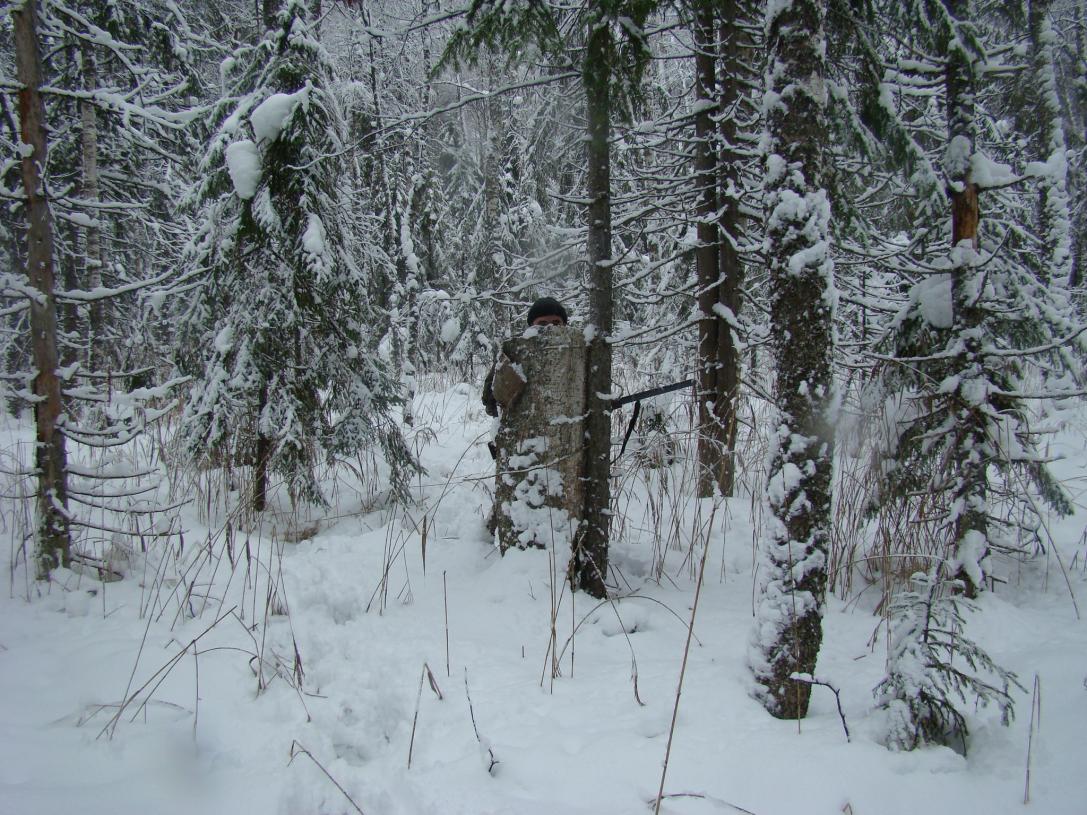Утро 23 февраля встретило мокрым снегом прямо в лицо. "Ах ты ж ёлки-моталки" - постучалась в голову мысль, но была жестоко придавлена сапогом, и вот уже экипаж из двоих человек, меня и Артёмки, выруливает на кольцевую. Снег бросается в стекло, пролетающие мимо грузовики накрывают мокрой волной, обочины пугают грязным неубранным снегом - но мы упрямо движемся туда, где этого нет - в лес! Приехали, с разбегу съезжаю на обочину и оказываюсь по бампер в снегу - дёргаюсь туда-сюда, вроде машина на брюхо не села, значит откопаемся, а сейчас - рюкзак на спину, ружьё в руки и вперёд.