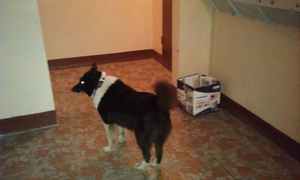 Приблудилась чёрно-белая лайка в дом на Северном проспекте. Район - Озерки. Пёс второй день ходит вокруг дома и греется в парадной.