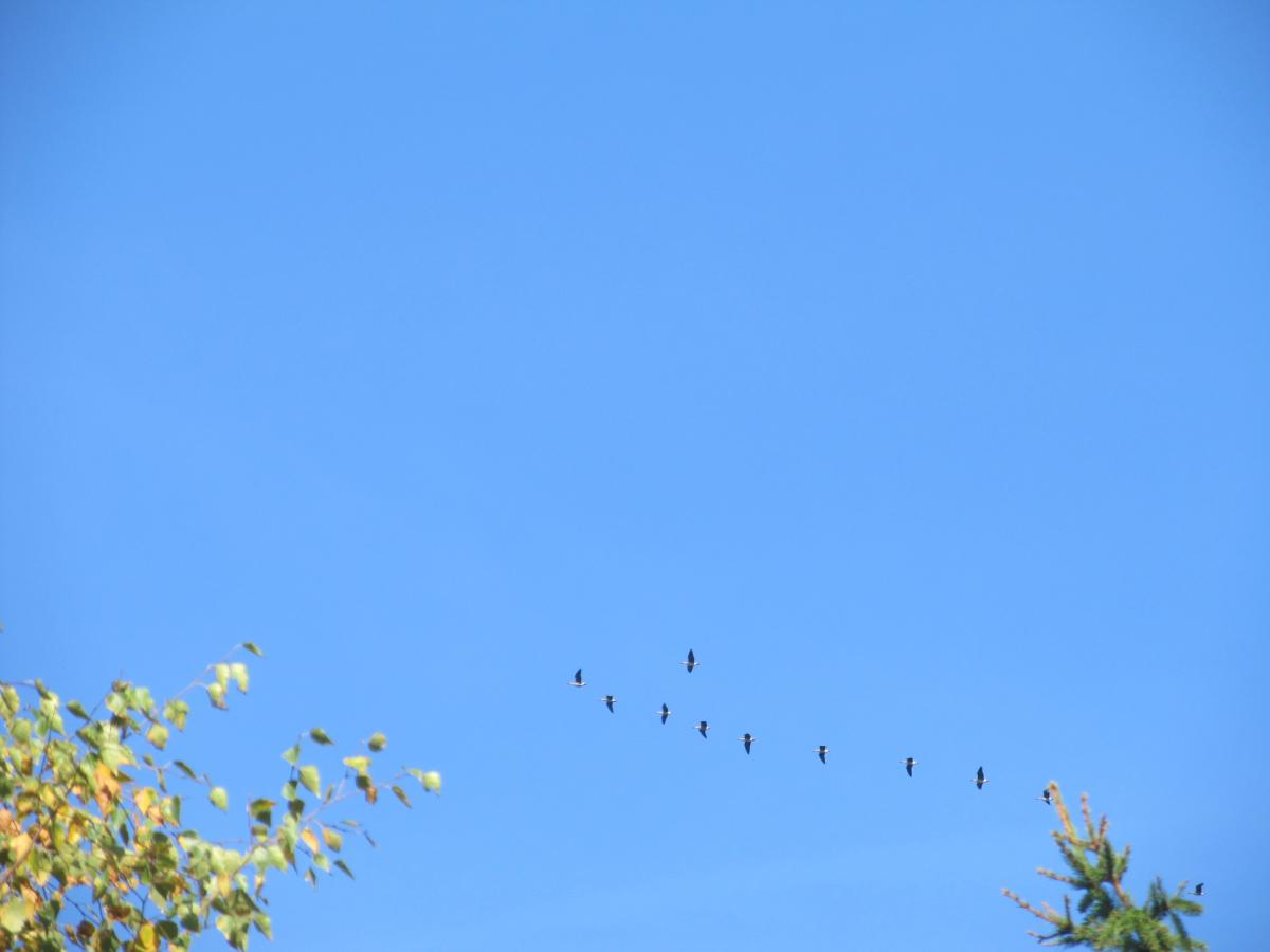 И семёрка в лоб мне налетела - красотища, однако... Последний в стайке как гадкий утёнок с выбитыми перьями летел, и как-то странно перекликался с остальными - те курлыкали, а этот как будто голос сорвал, выходило больше похоже на карканье...