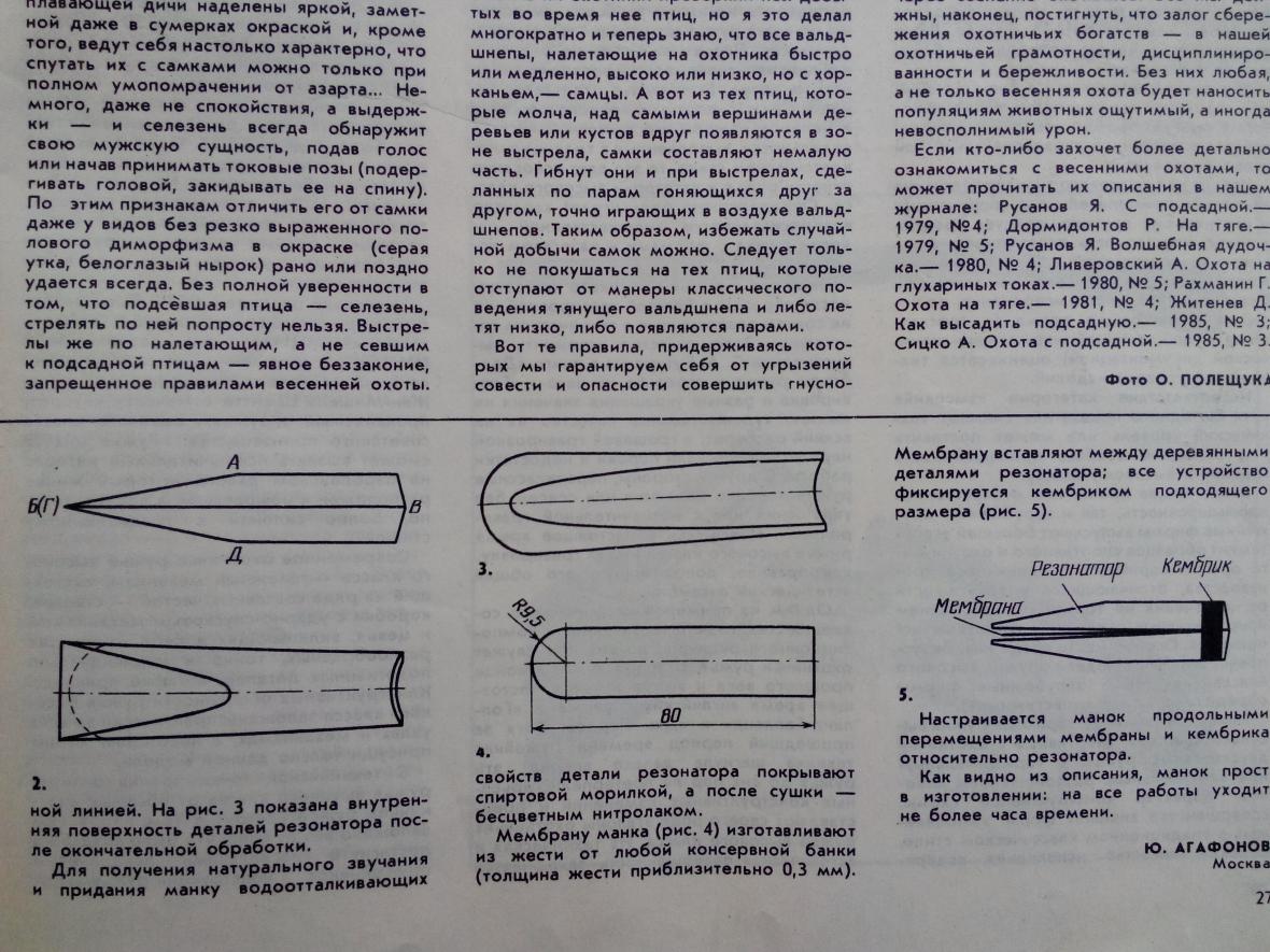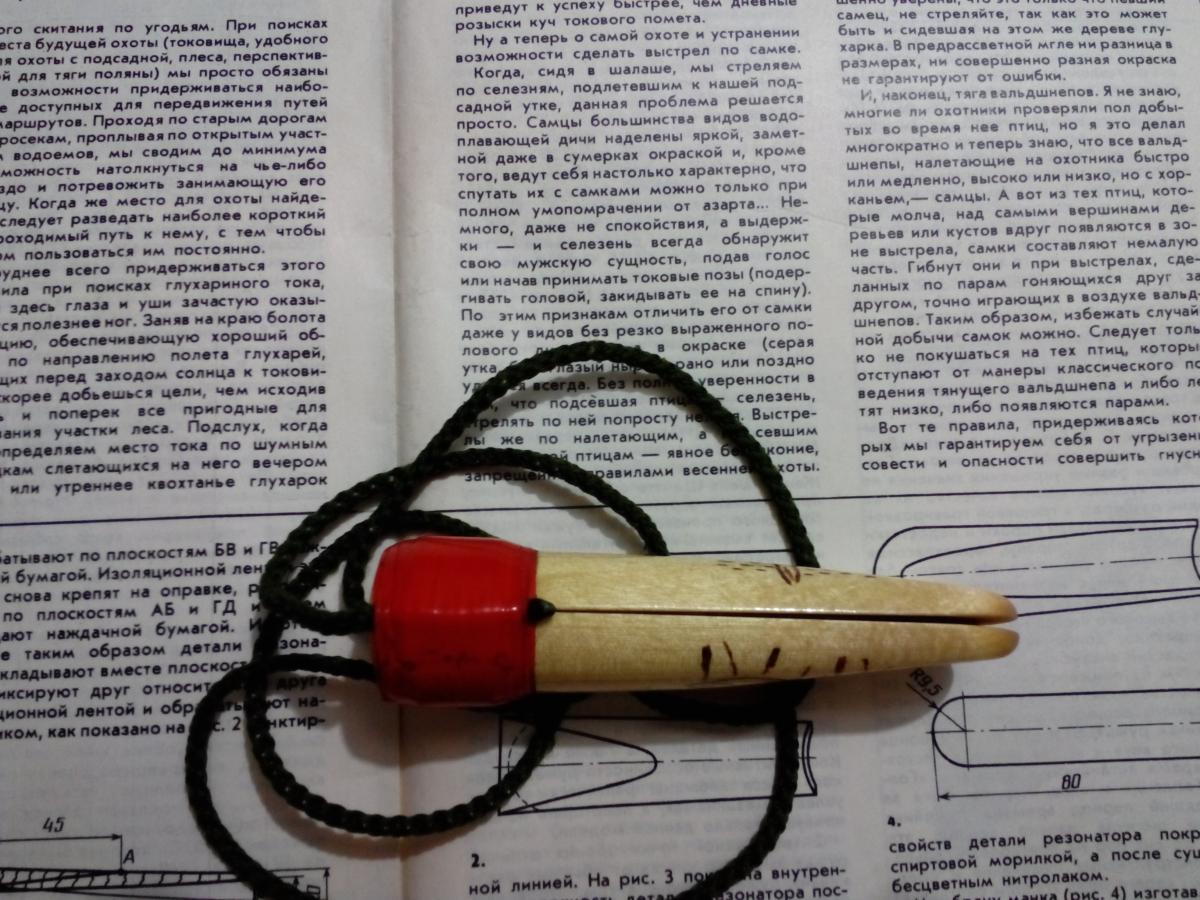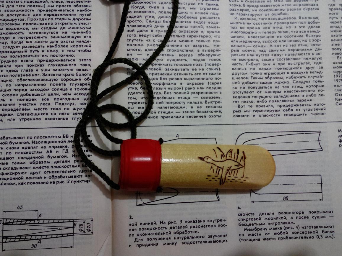 Хотел дождаться практических испытаний того, что удалось сделать и потом совместить тему с отчётом,но поскольку ,судя, по форумам интерес высок,не дотерпел.Может быть буду полезен,да и сам по советам, опытных товарищей, внесу коррективы.Одновременно хочется совместить темы о манках,сделанных на коленке,в одну.По мне ,так проще найти полезную инфу.Из сделанного некоторые идеи считаю своими так.как подобного в нете не видел.О правильности издаваемых собой звуков речи не веду.Добился чистых звуков,без посторонних шумов,а диапазон тональностей широк,также еще возможно чтото изменить.Пока,- гусь,вальдшнеп и рябчик,остальные пернатые в перспективе:ag:.Как говорил раньше,и снова повторюсь,на охотах пока не был,вот гдето так.:ah:
