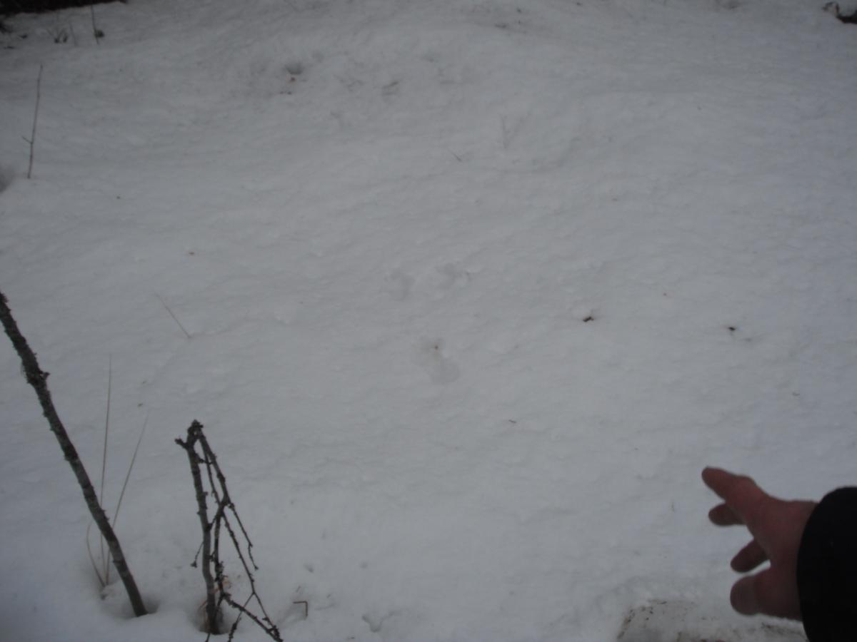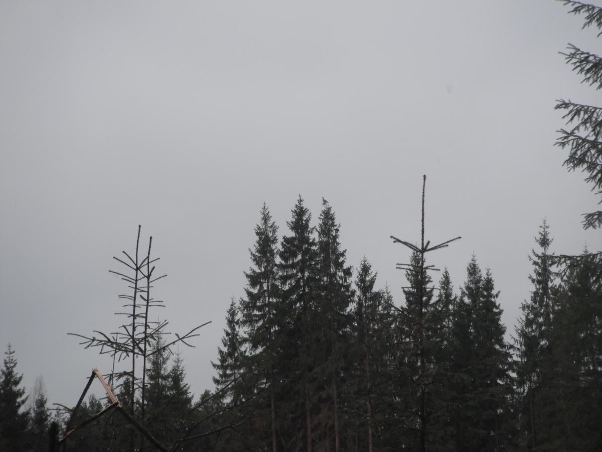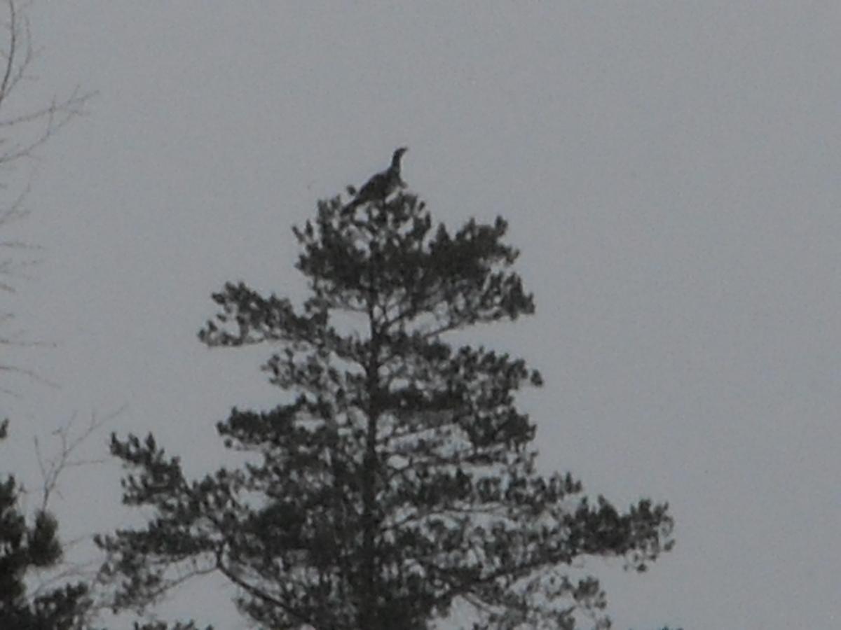 Не успели до нее доехать, как увидели свежие глухариные следы. Только вышли из машины, как над головой с грохотом пронесся глухарь. Метров через сто заприметили еще одного. Потом было еще несколько вырубок и практически на каждой по 2-3 глухаря! Итог прогулки-18 глухарей, с десяток тетеревов, и свежайший заячий след. Да, еще счастья полные штаны и зуд в предвещении открытия охоты:12: Смотрите внимательно на верхушки сосен.