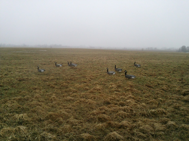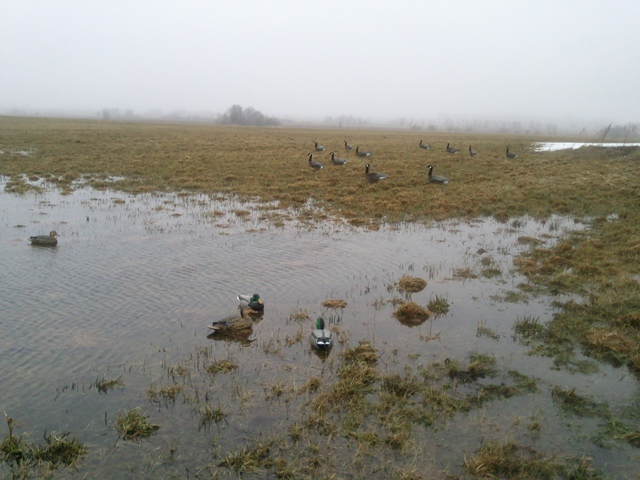 Нашел подходящее место, рядом с лужей поставил флюгера, чучела уток, скрадочек и пошел процесс... гусь шел плотно, хорошие стайки, но все по соседним полям