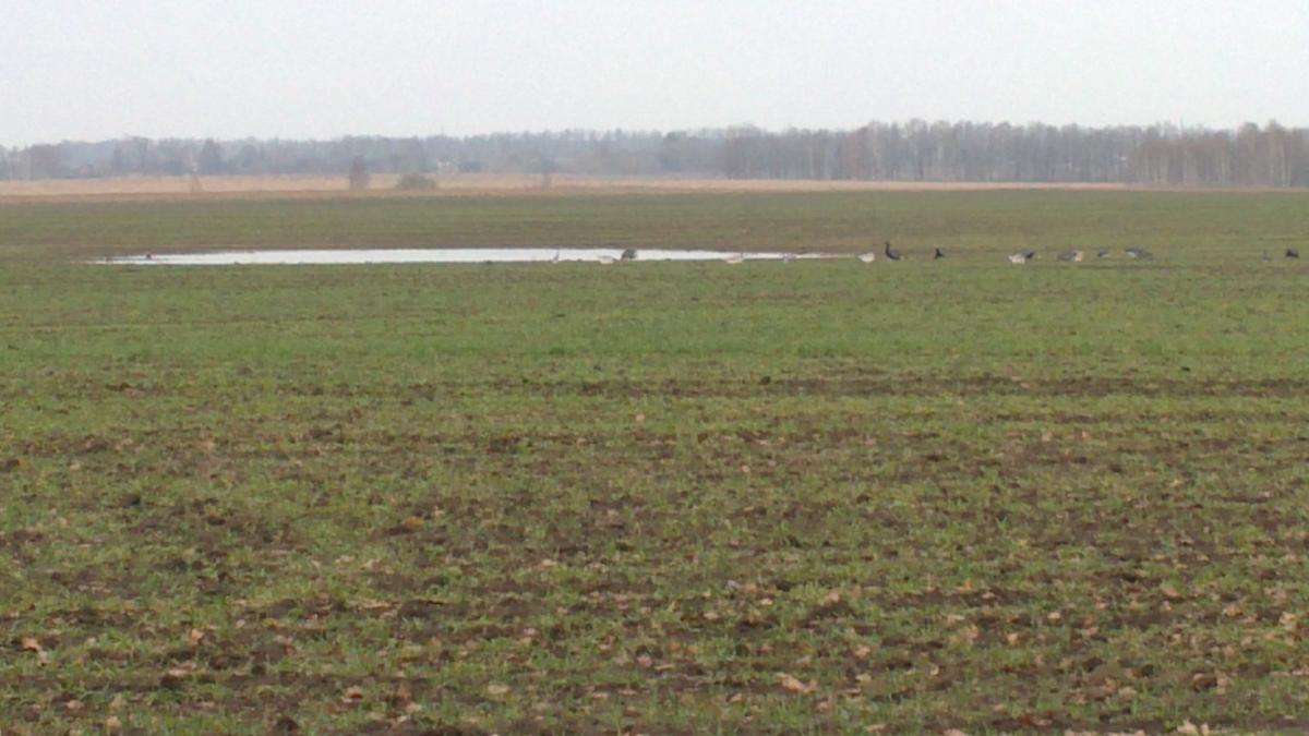 В понедельник с утра тоже решили пока не ходить к чучалкам, а посидеть в посадке и посмотреть – будет ли лет. За все время был налет только одной тройки. Но на выстреле от нас. Я выбил одного, а оставшаяся пара, как ни странно не запаниковала, а сделав большой круг опять вышла на нас. Опять стреляем. На этот раз повезло напарнику. Еще один упал неподалеку от первого. Оставшийся ушел на другую сторону посадки, но вдруг подал голос и вылетел из-за нее прямо у нас со спины. Мы к стрельбе готовы не были, но я успел-таки сделать выстрел уже на пределе. Попасть-то попал, но только подранил птицу и она пошла планировать вдоль поля и наискосок от нас. Планировал он около километра и сел в замеченном мной месте метров за 100 от посадки, пересекающейся с нашей под прямым углом. Делать нечего. Надо идти добирать. Благо в ту сторону поле слегка поднималось и было посуше. В общем ходил и искал его более часа. Ни на зеленях, ни на стерне его не было. Видно там хорошо. Особенно в бинокль. Решил напоследок обследовать дальнюю пересекающуюся посадку. Дошел до нее и пройдя метров 100 увидел подранка. Он меня тоже увидел и очень шустро побежал вдоль посадки. Поскольку стрелять было близко, чтобы не испортить тушку отпустил метров на 25 и прекратил его мучения. Поскольку патроны у меня очень кучные целил поверх головы, чтобы зацепить его краем осыпи. И правда в него пришла одна дробина перебив шею. Так что за этим трофеем пришлось изрядно побегать.