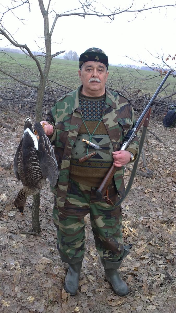 Во вторник мы опять на своем поле и опять решили посмотреть насколько интенсивным будет лет, посидев в посадке. Лет был, хоть и не очень активный. Тем не менее выдвинулись через зеленя на стерню и залегли. Довольно быстро и легко взяли по гусю. Потом лет сошел на нет. Посидев еще с час услышали одиночку. На манок он среагировал хорошо, но, видимо кто-то из нас плохо накрылся сеткой или он заподозрил еще какой-то подвох, и стал отворачивать. Напарник не выдержал и выстрелил. Опять подранок. Почти упал метрах в 70 от нас. Только напарник собрался за ним идти, как гусь поднялся на лапы и побежал в сторону реки. Я пару раз выстрелил вдогонку, но бесполезно. Товарищ мой с больным сердцем, значит идти добирать опять мне. В ту сторону поле понижалось, а значит ближе к разливу, до которого более километра становилось все более раскисшим. Но делать нечего, пришлось топать. Снял куртку, отстегнул патронташ чтобы было полегче. Второпях вытащил из патронташа пару патронов, сунул их в карман и пошагал. Как же было тяжело. Подранок то подпустит меня метров на 60 - 70, то опять поднажмет и оторвется дальше. Всю дорогу ближе чем на 60 метров не подпускал. Быстро идти, а тем более бежать не могу – вязко. Чуть поближе подойду – стреляю. Но все 5 выстрелов с такого расстояния его обносило. Сунул в магазин из кармана те два патрона что захватил. Оказалась четверка. Ну этим патроном с 60 метров его не добрать. Я стал уже сдавать и мысль была бросить его нафиг. Гусь тоже видимо стал слабеть и мне удалось сократить дистанцию метров до 50. Стреляю предпоследним патроном – обнос. Край поля и начало разлива уже близко. Но подранок ослаб еще сильней. У меня тоже руки – ноги уже трясутся, дыхание с хрипом, состояние предобморочное. Но собрал остаток сил и малость поднажал. Ситуация такая – от меня до подранка метров 30-35, от подранка до уреза воды метров 5. Еще пара-тройка секунд – и он на воде. Тогда его уж не взять. Уплывет и погибнет где-нибудь. На последнем дыхании, последним патроном выцеливаю его и стреляю. Как уж трясущимися руками не промахнулся – сам не знаю. Видимо помог коллиматор. Кстати, на этой охоте впервые использовал коллиматорный прицел и очень им доволен, хоть многие к нему и относятся при стрельбе дробью отрицательно. Вобщем гуся я добрал. Звоню напарнику, чтобы он снимал чучалки и топал потихоньку к машине, т.к. я сам уже почти при последнем издыхании. Минут 20 восстанавливал дыхание и приходил в себя. Поскольку трудился с этим гусем я, то мы и решили, что он мой.