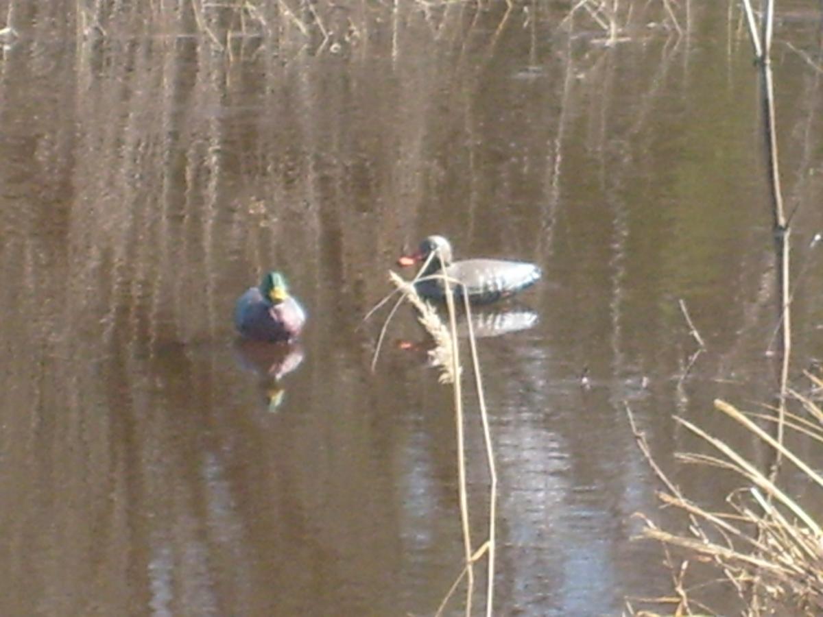 Разместились на повороте реки у небольшой заводинки, выставили чучела. Долго ждать не пришлось. Вот он первый трофей этой весны. А заодно и первый трофей добытый с новым ружьём (Пегасус).