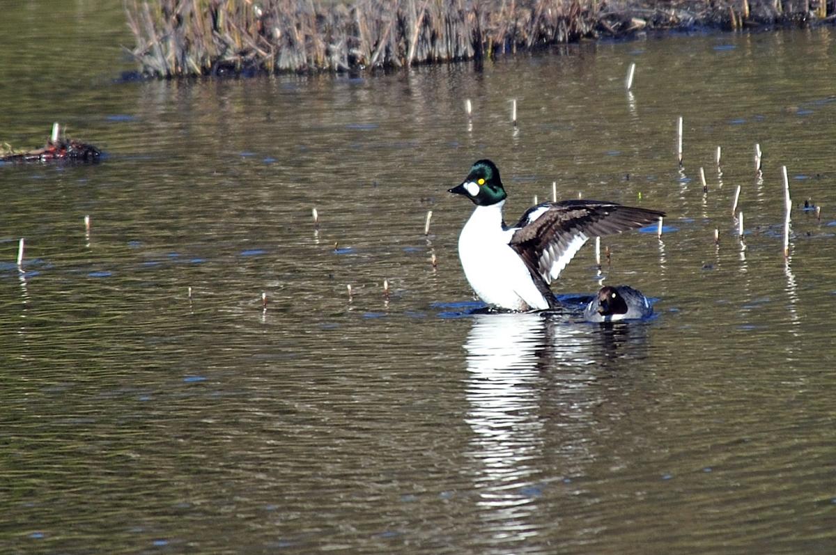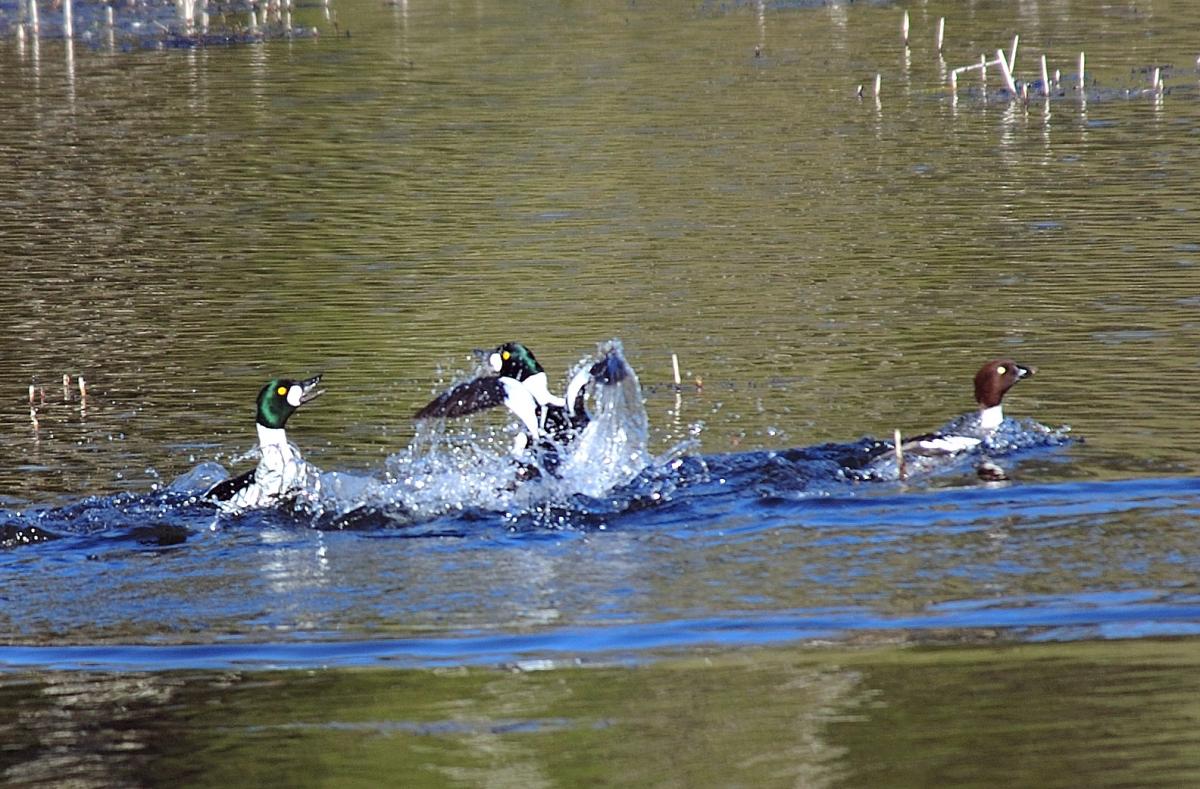 Сверху на фото чирок -свистунк подсел к самке гоголя , снизу подлетела его подружка ...Очень мелкая утка , расцветка самки самая обычная без изысков ...