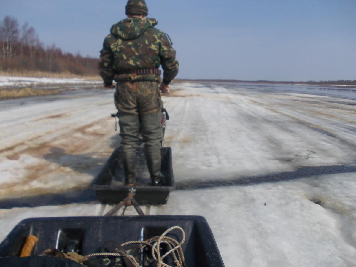 Решили ехать за гусем,* хотя над городом до открытия видели всего трех штук. Поехали *с сыном, чтобы забратся подальше решено было взять с собой мотобуксировщик и еще сани от снегохода, они потом служили основанием для засидки. И загрузив в них мотобукс преодолевали закраины речек. Вечером 20 го добрались до места переправили мотобукс, посидели у ребят в бунгале( они приехали на открытие, но не на охоту). И утром в 4 утра поехали. Охотились до обеда взяли 8штук пополам белолобые и гуменники. Считаю что охота открыта во время, хорошо что Кувшинников О.А* не поддался на перенос охоты.И вобще с его приходом хоть он и не охотник больше сдравого смысла стало в охот. делах.