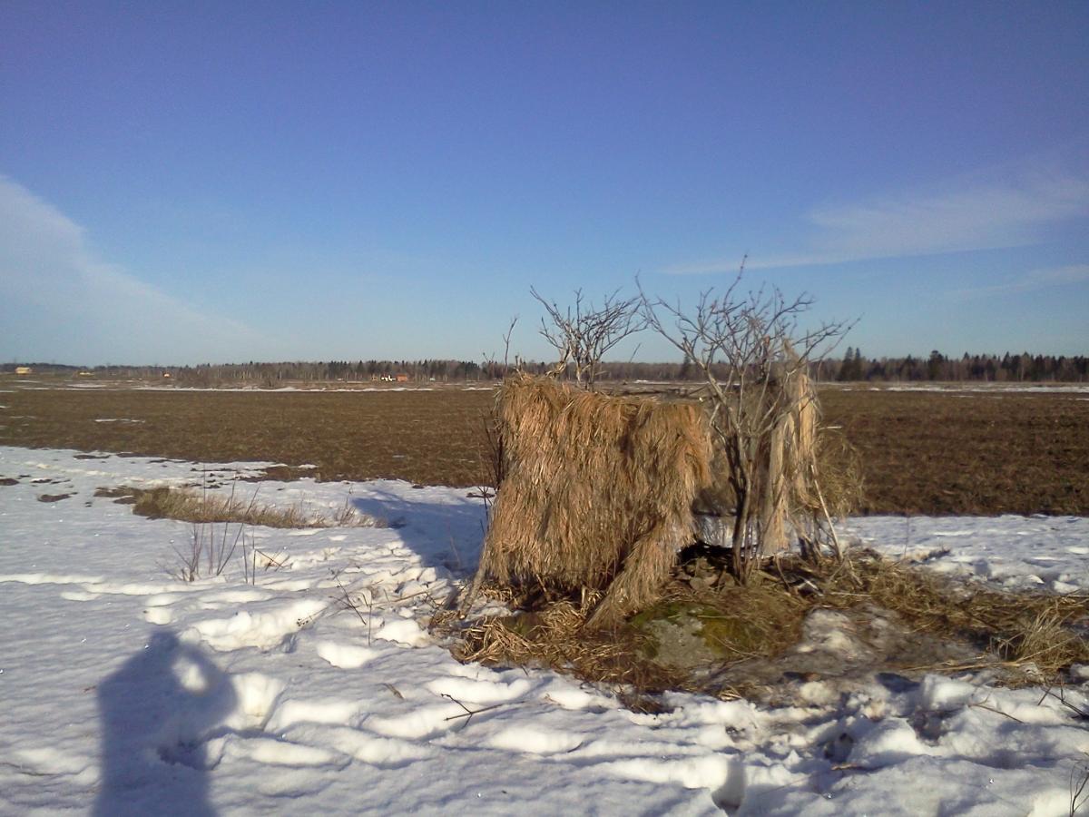 В воскресенье не выдержал(тем более был отпуск) и отправился в ночь в Ломоносовский район. Часам к двум управился и лег спать. Утром ударил морозец. Сижу жду. В итоге два 100 % налета и как всегда подвел косой глаз.Ближе часам к 12 стали крутиться гусики. Но тут ко мне пожаловал гость, который укорял себя что перепутал сидящих на поле журавлей с гусями и не ударил по поднявшемуся зайцу в пятнадцати метрах от него, боясь спугнуть птицу к которой он собирался подойти. И откуда такие берутся. В итоге снялся с места и перебрался еще поглубже в поля. Потом начался сильный дождь , промок до нитки и поехал домой оставив все свое добро на поле. Вернулся во вторник к вечеру. Гусей небыло и я решил поманить уточку. В итоге прямо на пашню за вечер приземлились 3 зеленоголовых красавца где и остались покоится с миром. В среду утром утром у меня случилась беда с колотушкой-перестала перезаряжать, а гусь пошел и было неменее 5 налетов, но увы. Я быстро к машине, разобрал, почистил и обратно в шалаш. И ту какая-то х… В 200 метрах от меня на чистом поле шарахается какой-то обморок и пытается кого-то застрелить. посидев немного я двинулся на завтрак и это чудо прилезло ко мне. Я такие рассказы еще не слышал!!! Оказывается он все утро пытается подойти на выстрел к перелетающим и бегающим по полям ВАЛЬДШНЕПАМ. У меня задергался глаз. Да еперный бабай я увижу хоть одного нормального охотника. Причем я понимаю если бы это были молодые ребята, но когда человеку за 40 какой ты на х… охотник-сиди дома!(в том плане что можно набраться опыта)