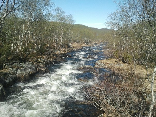 Но фиг с ним, с заливом: главная фишка речки летом, когда в неё заходит атлантический лосось, он же сёмга. В отличии от Титовки, Печенга более равнинная река, серьёзные водопады начинаются только в верхней трети течения. Что это даёт? А благодаря этому сёмга поднимается выше по течению, чем в Титовке и спокойно распределяется по реке, кроме того, стадо больше. Т.е. «толкаться локтями», как Титовке не нужно. Здесь расположены два рыбопользовательских участка, я «рыбопользую» верхний, началом от пос. Корзуново до слияния рек Лота и Печенга. Всего в длину участок около 7 километров, развернуться есть где. Вокруг расположено множество воинских частей, так что переезжающий вброд через речку танк ни кого не удивляет. Вместе с тем, всего в двух шагах от стиля «милитари» потрясающая тишина и рыбалка! Река, хотя и более равнинная, чем Титовка, тем не менее, в равной мере изобилует перекатами, сливами и струями. В этом году, впрочем, как и в прошлом, «Мурманрыбвод» ценник установил вполне гуманный, вот только со сроками фигня какая-то, поздно открывают, рыба уже сейчас заходит. Знакомый, истосковавшийся по рыбалке, несколько дней назад, втихаря мухой часа 4 по воде колотил, но «пионера» сёмужного стада на 12 кг. зацепил. Не-не-не, с почётом выпустил, рыбак законопослушный, но вечером в гараже соло о рыбе не прекращалось весь вечер, человек хапнул "глоток воздуха".