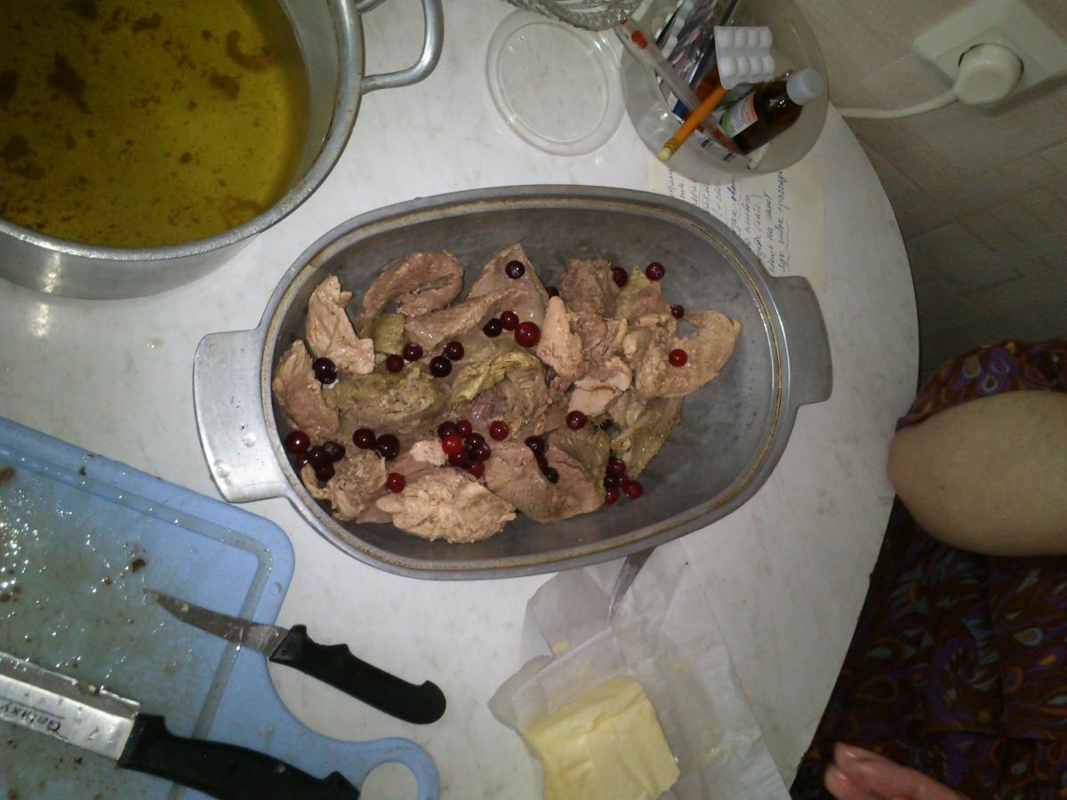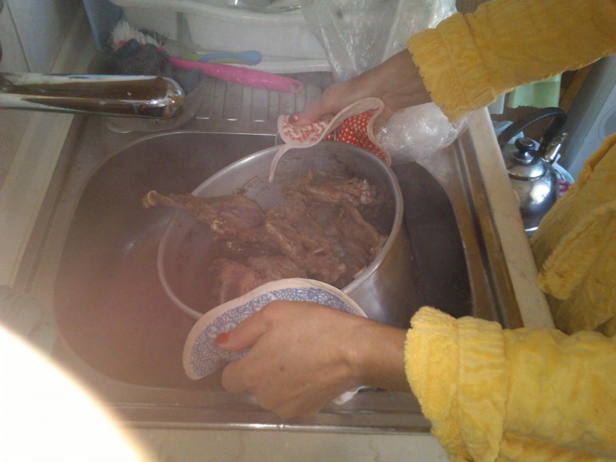 1. Тушка разделывается и вариться, пока не всплывет свернувшаяся кровь. Вода сливается, мясо промывается.