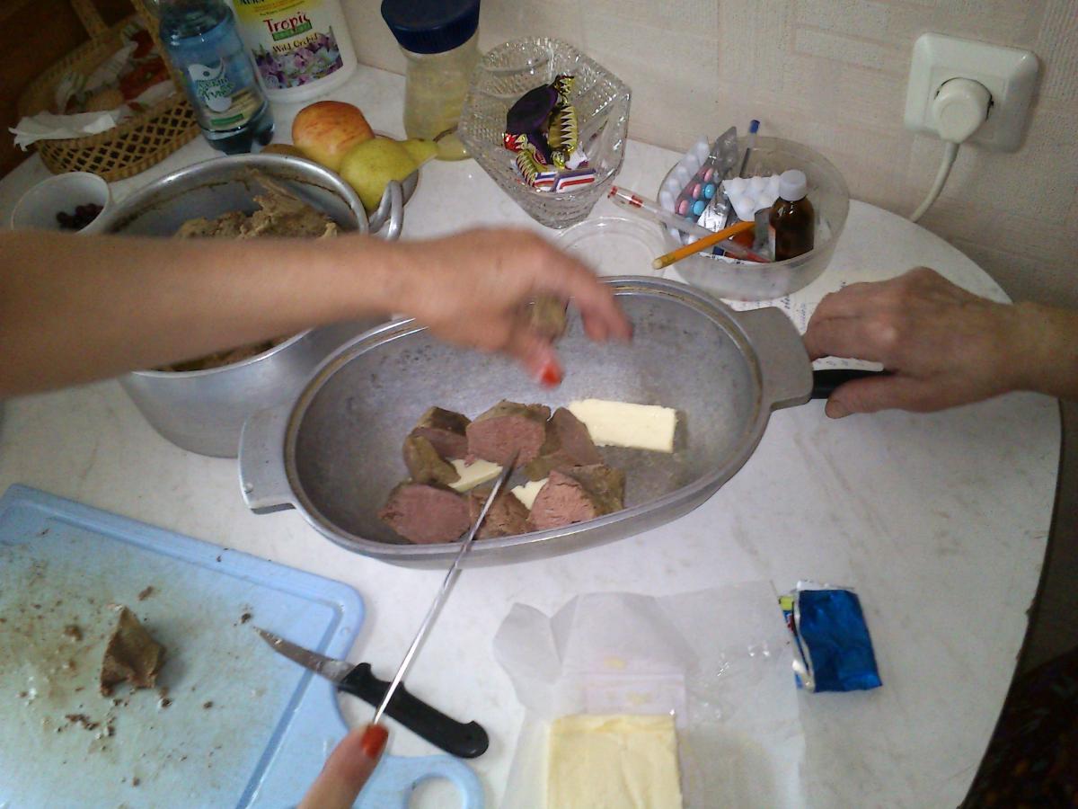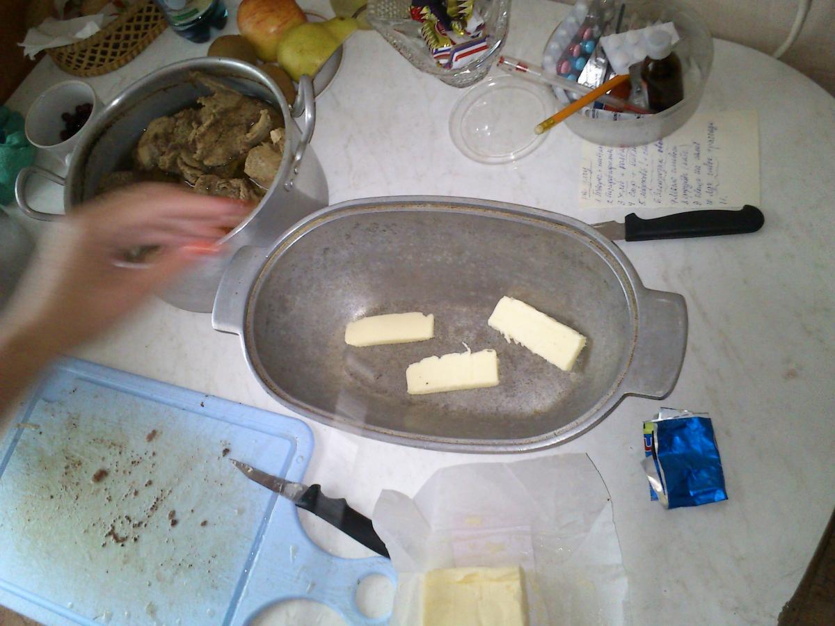 3. На дно утятницы кладется сливочное масло, сверху укладывается мясо, потом опять сливочное масло. Долить бульен почти на 2/3. Посолить, поперчить, можно добавить немного хмели-сунели.