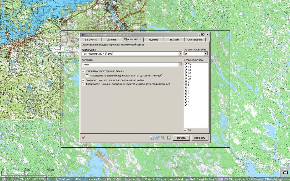 vaterpahk, чтобы загрузка проходила как можно быстрее, всегда выкачивается только один, максимально крупный масштаб тайлов карты. Для карты ГГЦ 250м (*png) максимально крупный масштаб тайлов на сервере = 16. Нижестоящие нужные масштабы формируются уже локально программой Сас-Планет. Вышестоящие же масштабы искусственно формировать никакого смысла нет, по сравнению с максимальным масштабом информации не прибавится, картинка испортится и в геометрической прогрессии возрастёт общее число локальных тайлов.