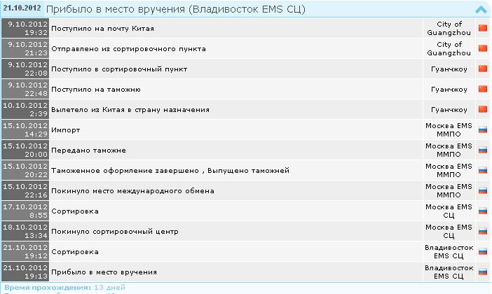 << 03.10.2012 00:27 104010 МОСКВА Ems Импорт (Отправление прибыло в страну назначения) >>