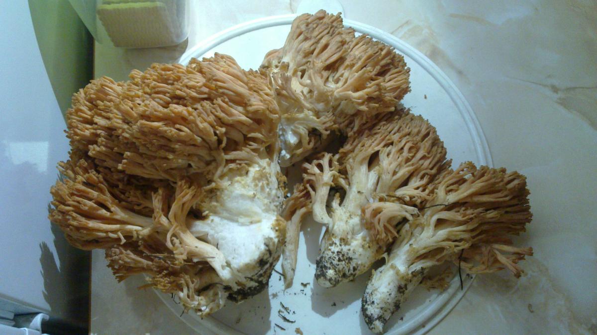 Один боровик, три подосиновика, два черноголовика, кучка лисичек и это ЧУДО. Ромария вроде кличут, или рогалик.